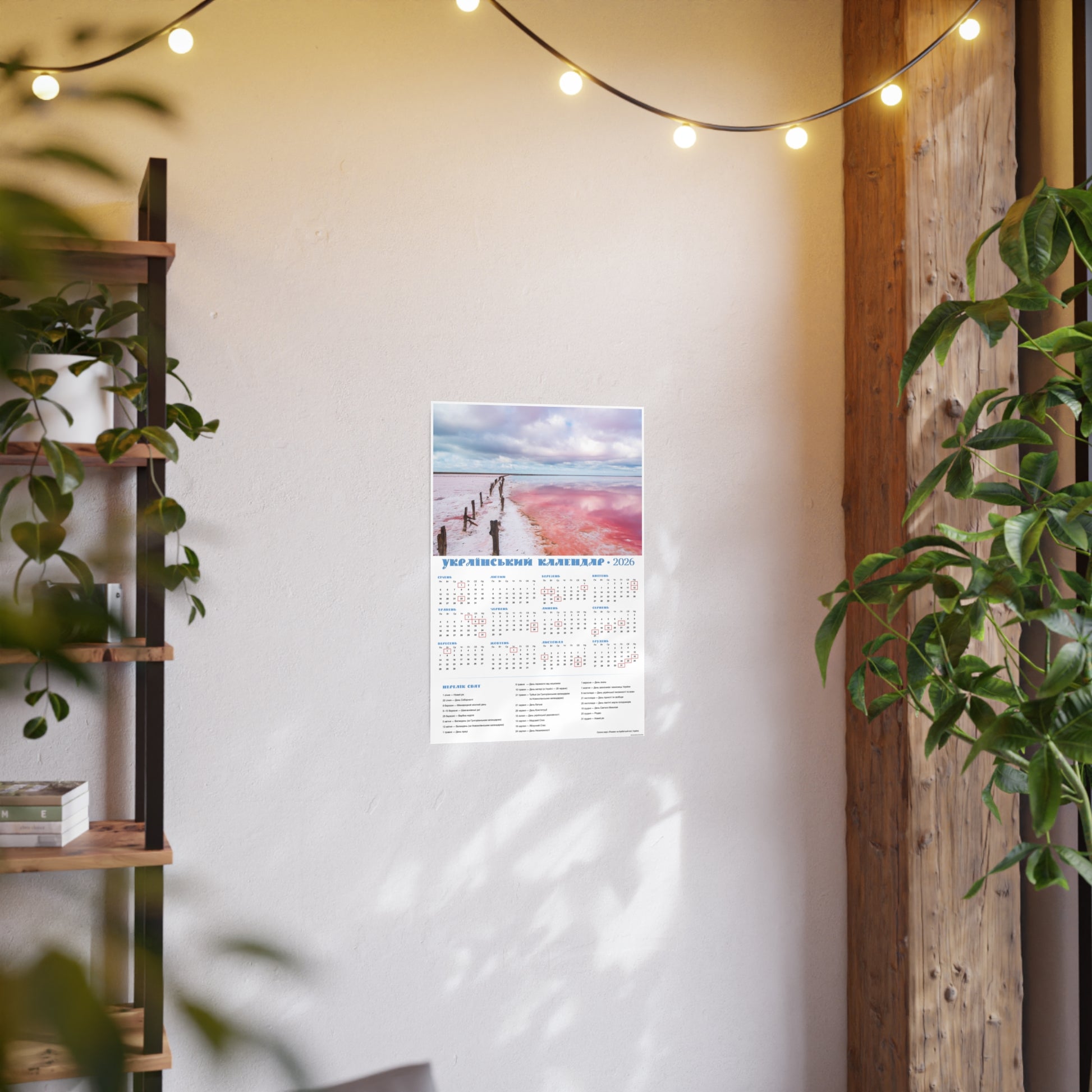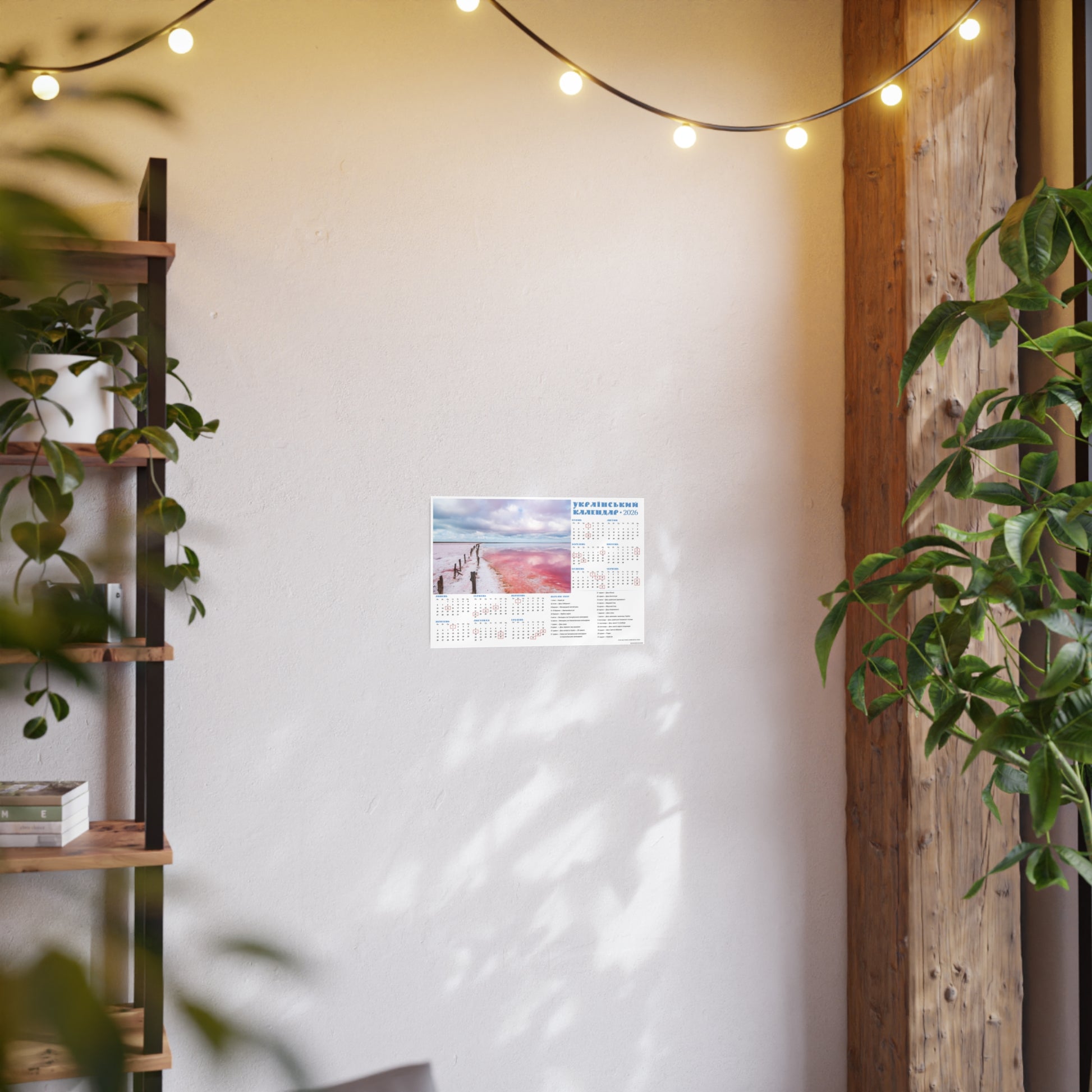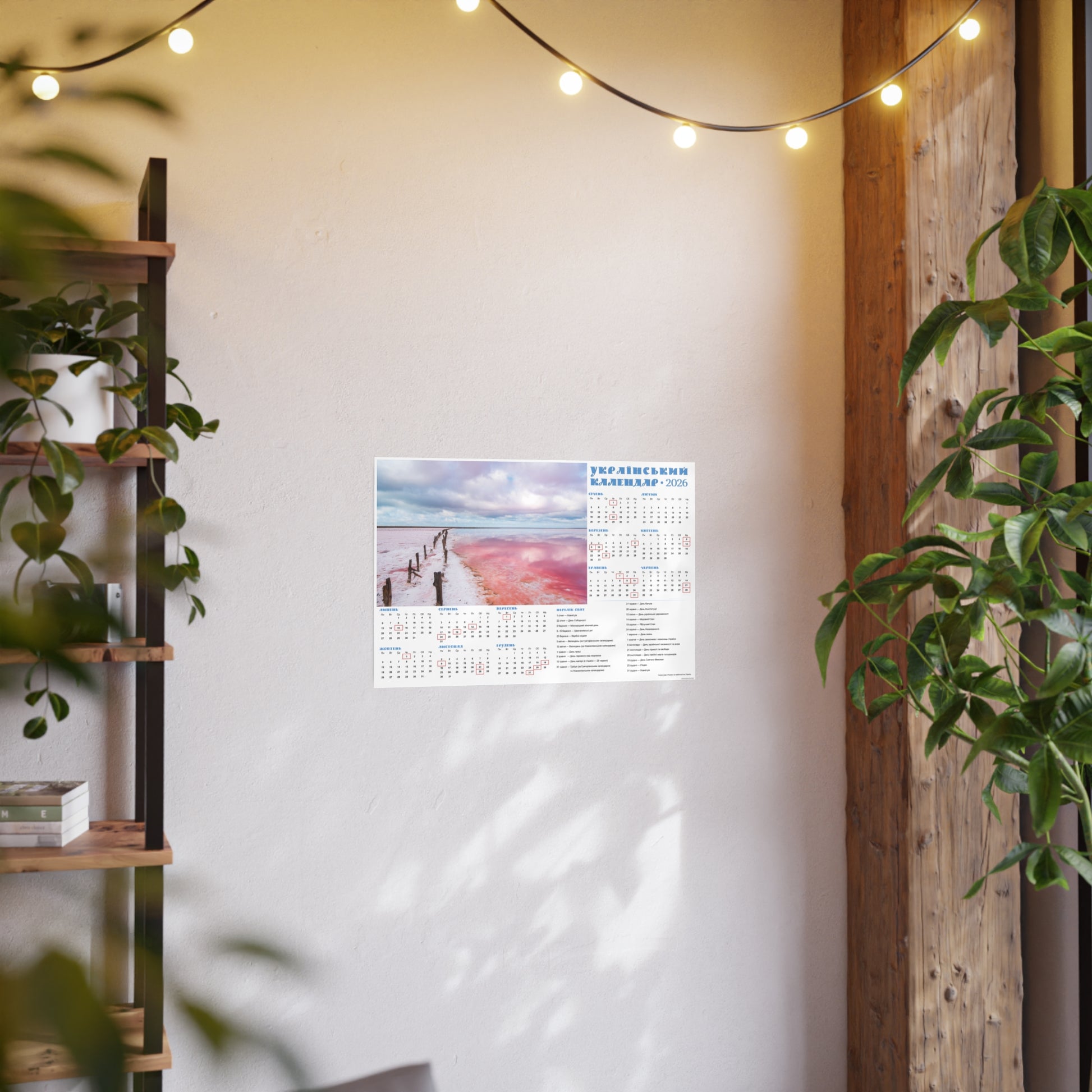 The one-page poster calendar "Salt lake "Pink" on the Arabat Spit" belongs to the series 2026 Ukrainian Calendar CANADA, created exclusively for Ukrainians and friends of Ukraine in CANADA. The vocation of this series is to add Ukrainian coziness to your home, so poignantly native and thick with the scents of mint, wild thyme, lovage and other fragrancy; to become a window into the Ukrainian coziness, wherever you are.