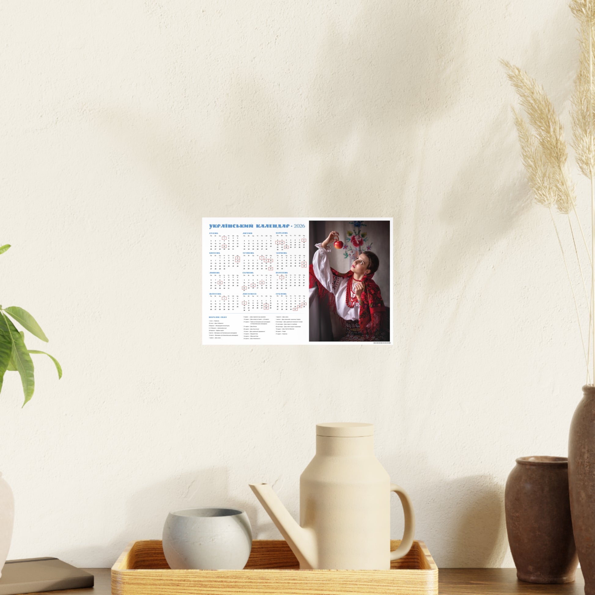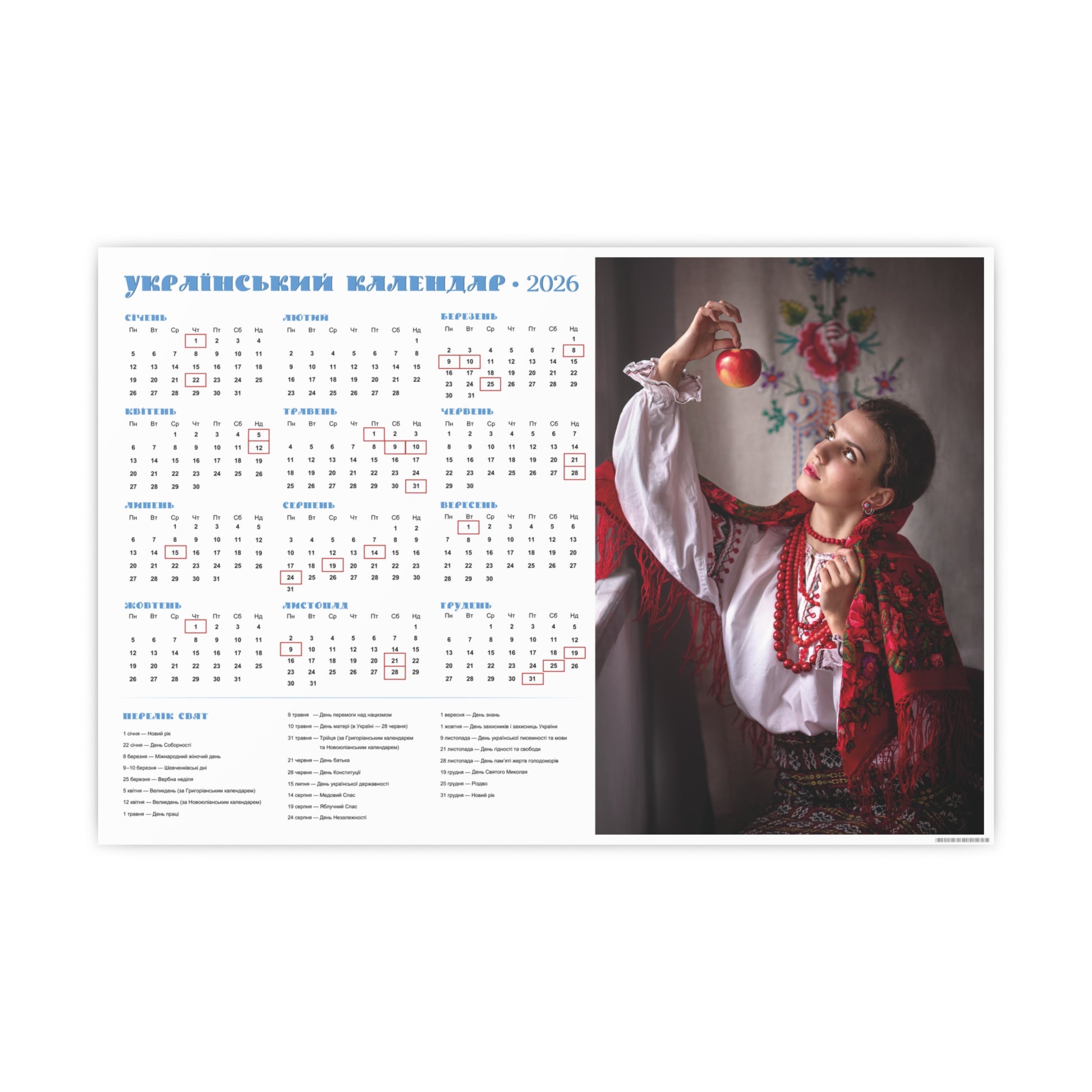 The one-page poster calendar "Apple" belongs to the series 2026 Ukrainian Calendar CANADA, created exclusively for Ukrainians and friends of Ukraine in CANADA. The vocation of this series is to add Ukrainian coziness to your home, so poignantly native and thick with the scents of mint, wild thyme, lovage and other fragrancy; to become a window into the Ukrainian coziness, wherever you are.