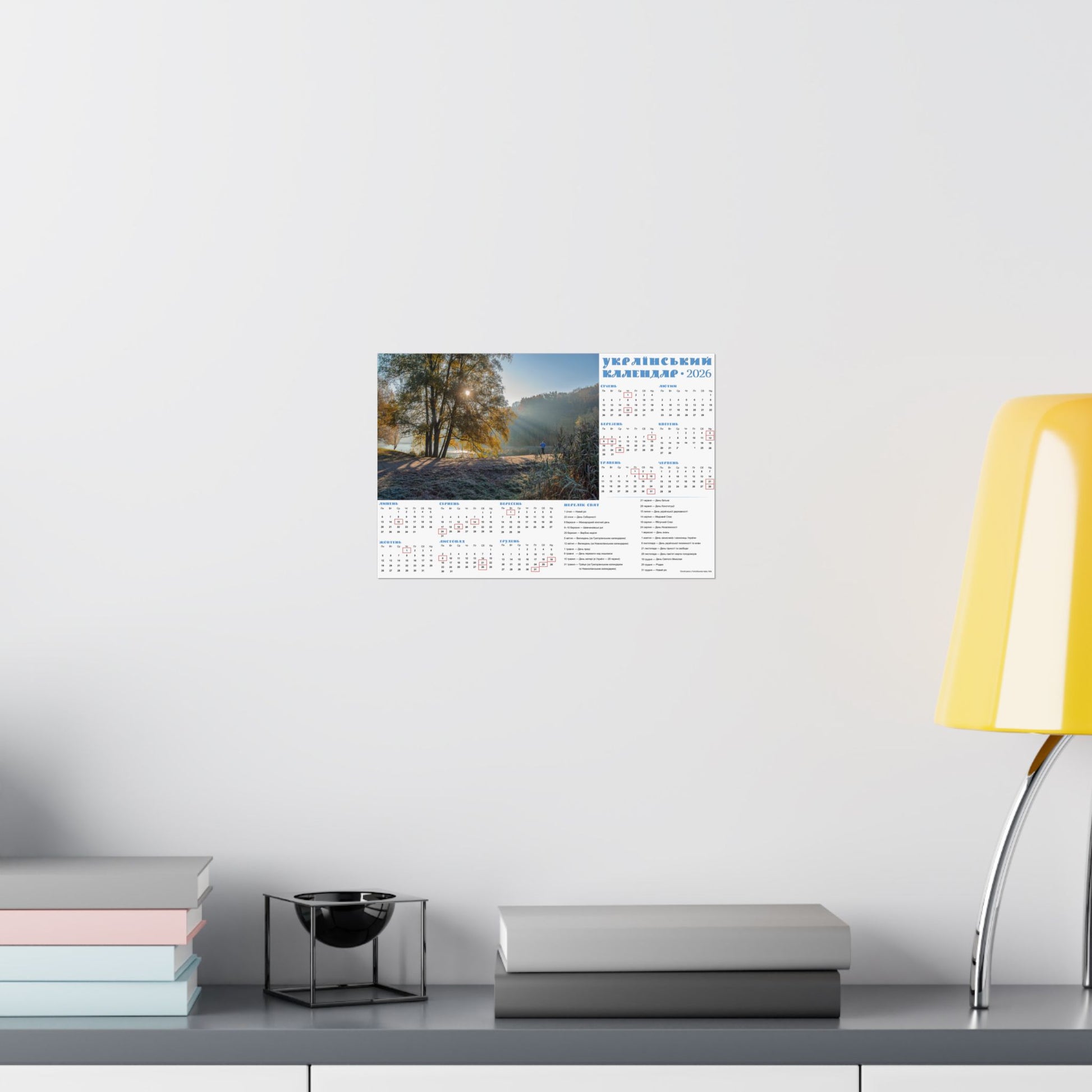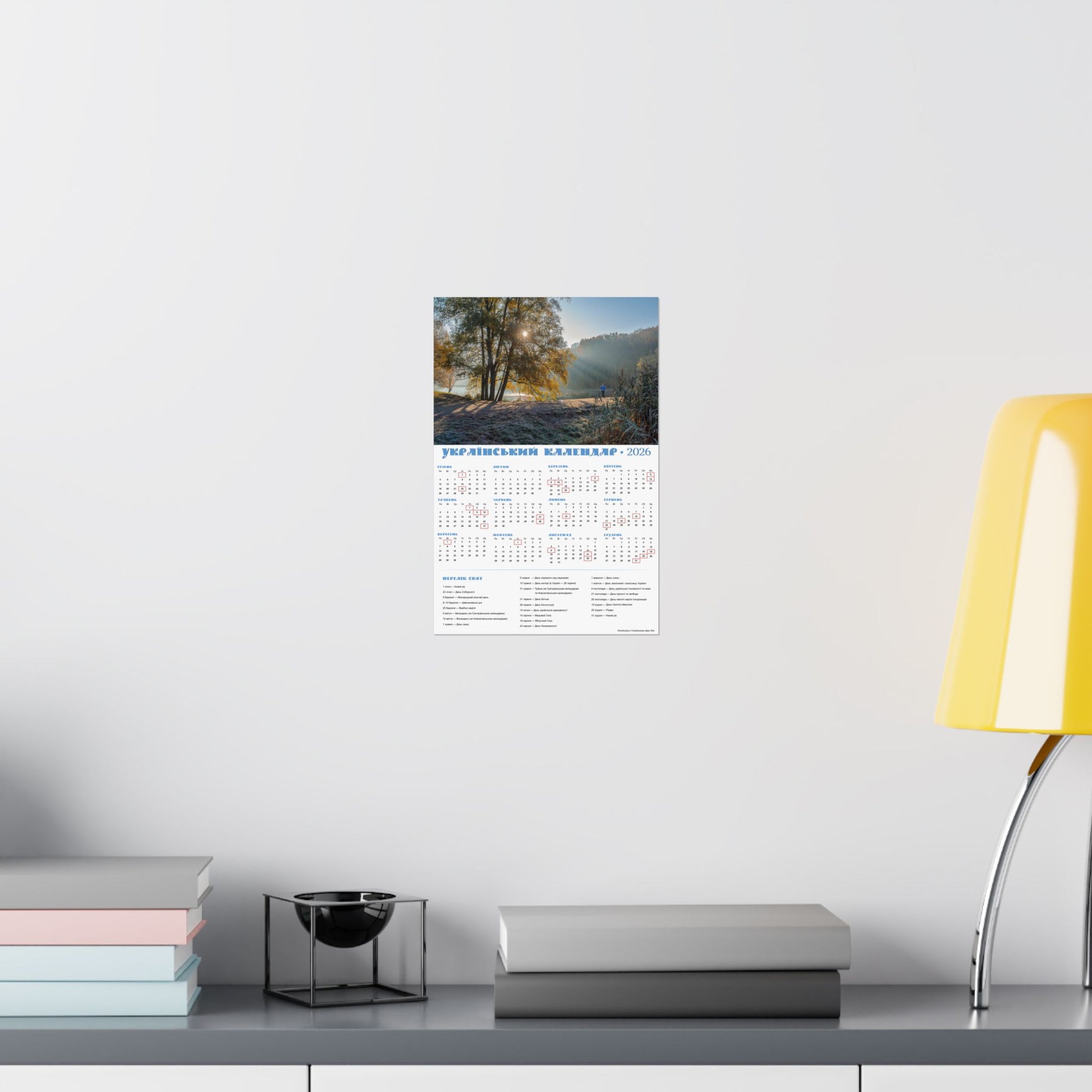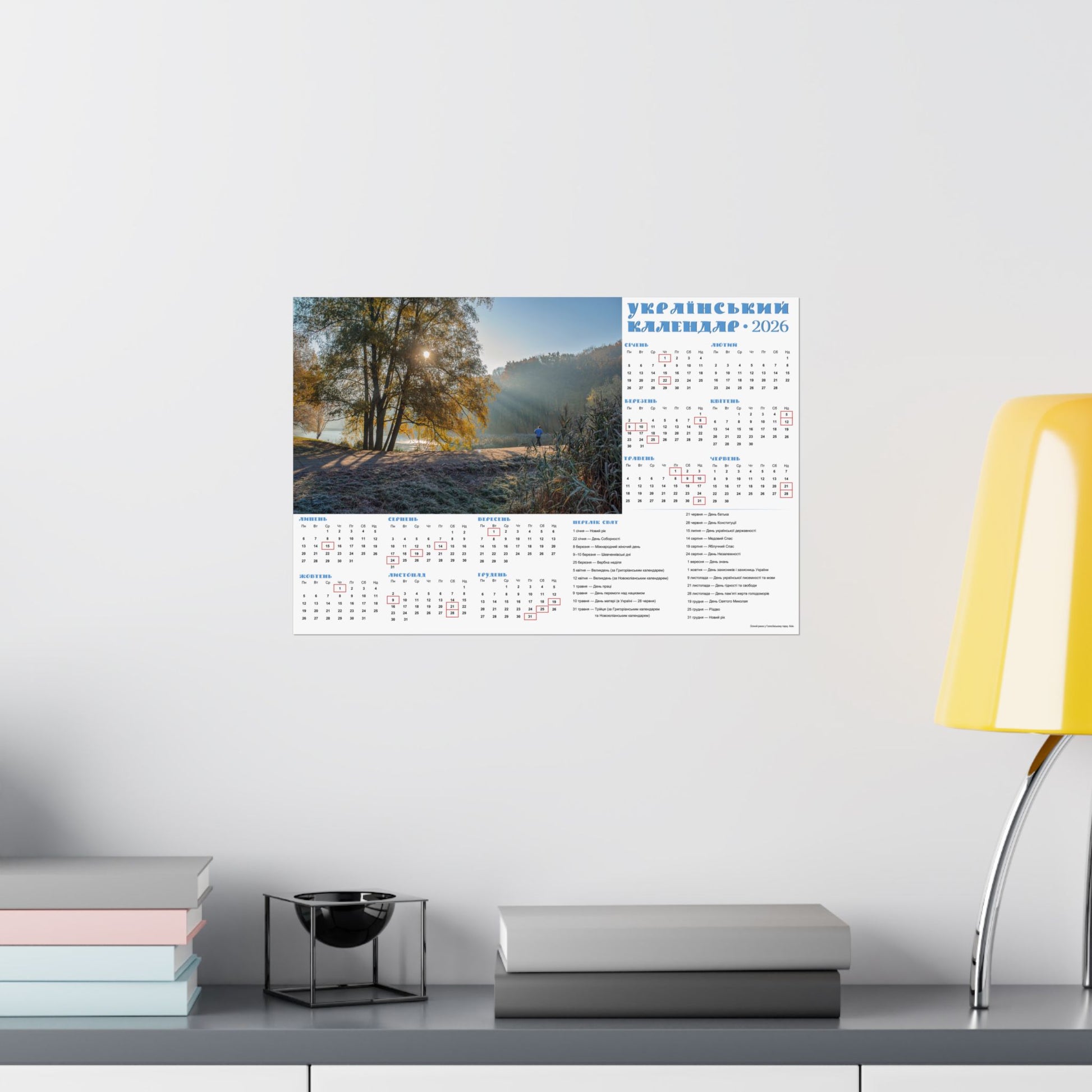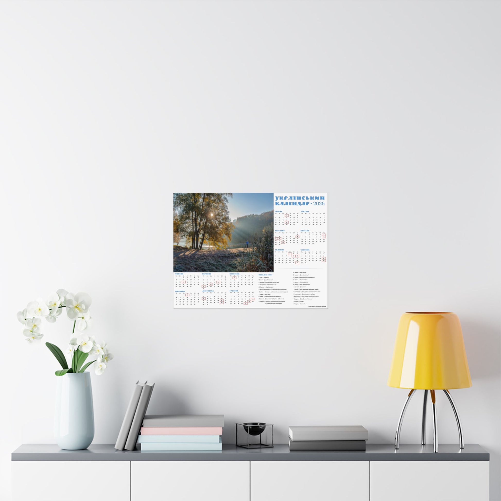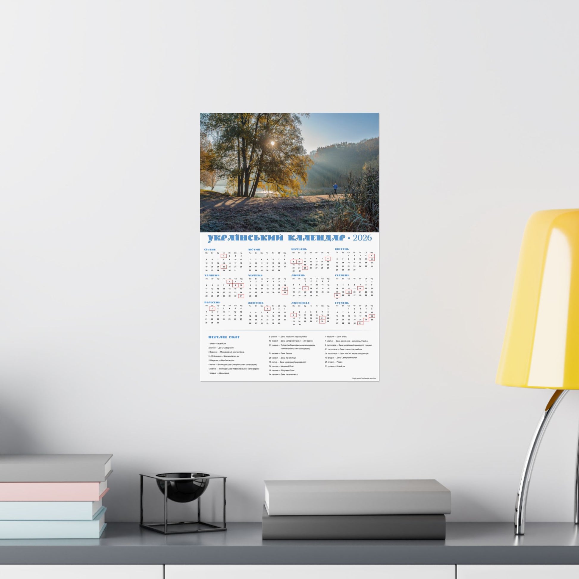 A satin poster printed on museum-grade satin paper that brings a calm, sunlit morning into your home. The image captures a misty riverside at dawn—soft rays filtering through trees, cool frost on the grass, and a quiet sense of slow, early light. The calendar layout beside the photo makes this piece both decorative and useful: months arranged clearly with local holidays marked, and a compact reference panel for planning the year. Low-glare satin finish keeps reflections subtle so the scene and calendar details stay readable in natural light. Hang it in a kitchen, entryway, studio, or office to anchor your day with a gentle, contemplative moment each time you pass by.