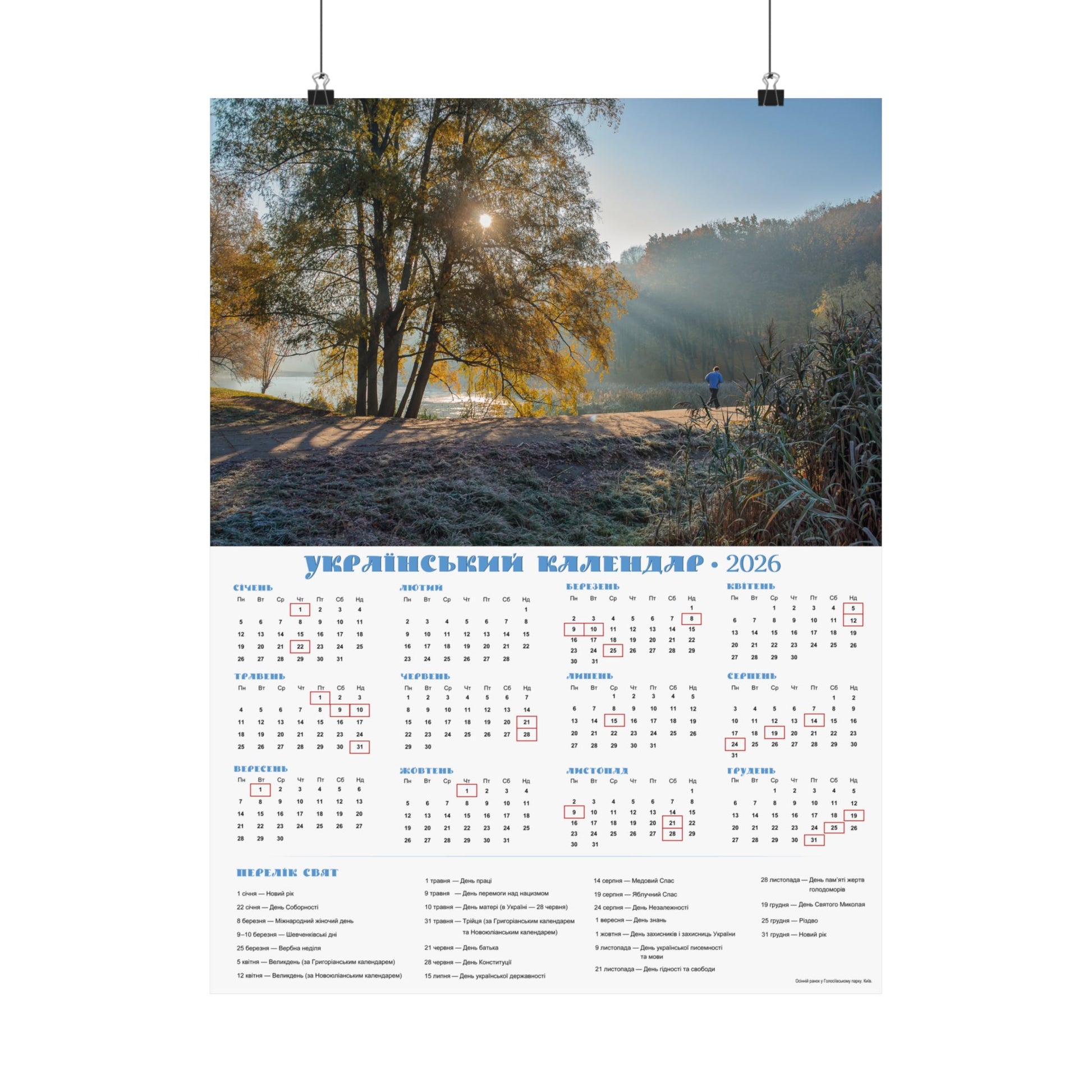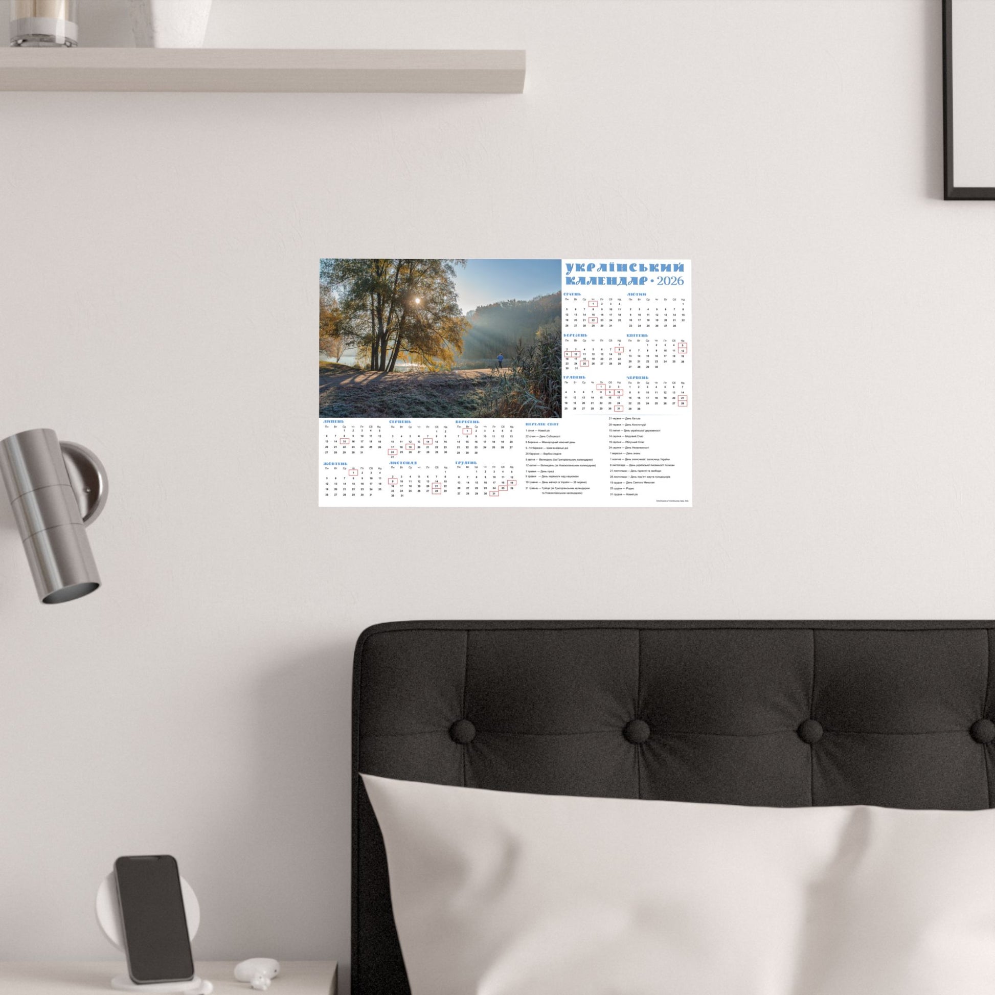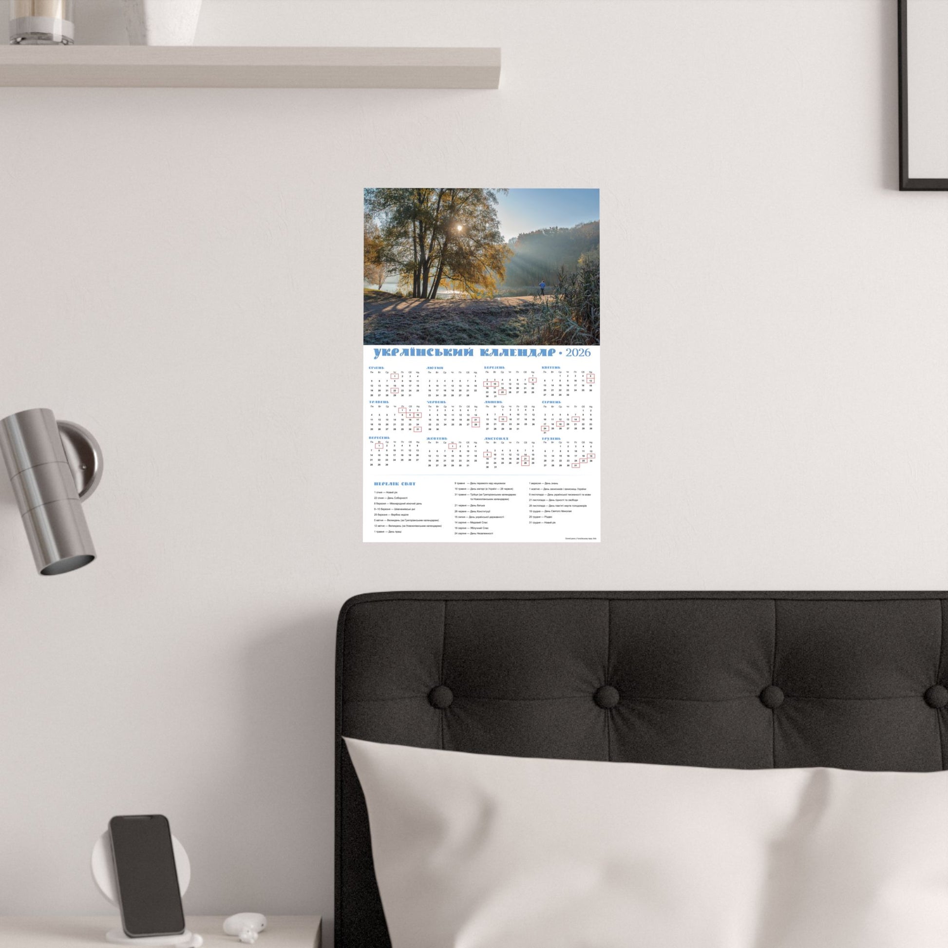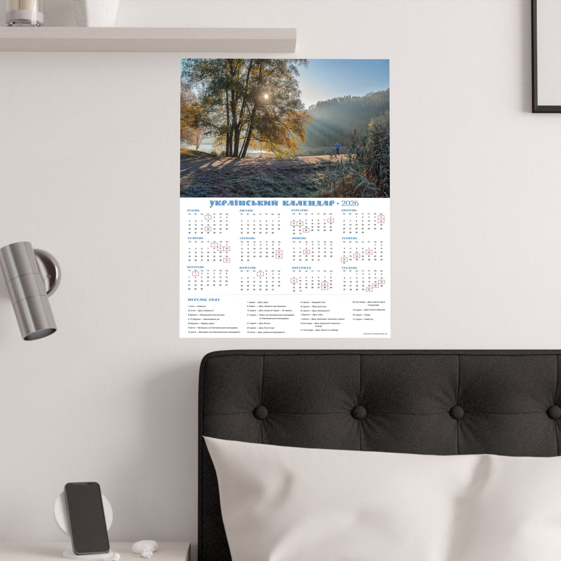 A satin poster printed on museum-grade satin paper that brings a calm, sunlit morning into your home. The image captures a misty riverside at dawn—soft rays filtering through trees, cool frost on the grass, and a quiet sense of slow, early light. The calendar layout beside the photo makes this piece both decorative and useful: months arranged clearly with local holidays marked, and a compact reference panel for planning the year. Low-glare satin finish keeps reflections subtle so the scene and calendar details stay readable in natural light. Hang it in a kitchen, entryway, studio, or office to anchor your day with a gentle, contemplative moment each time you pass by.