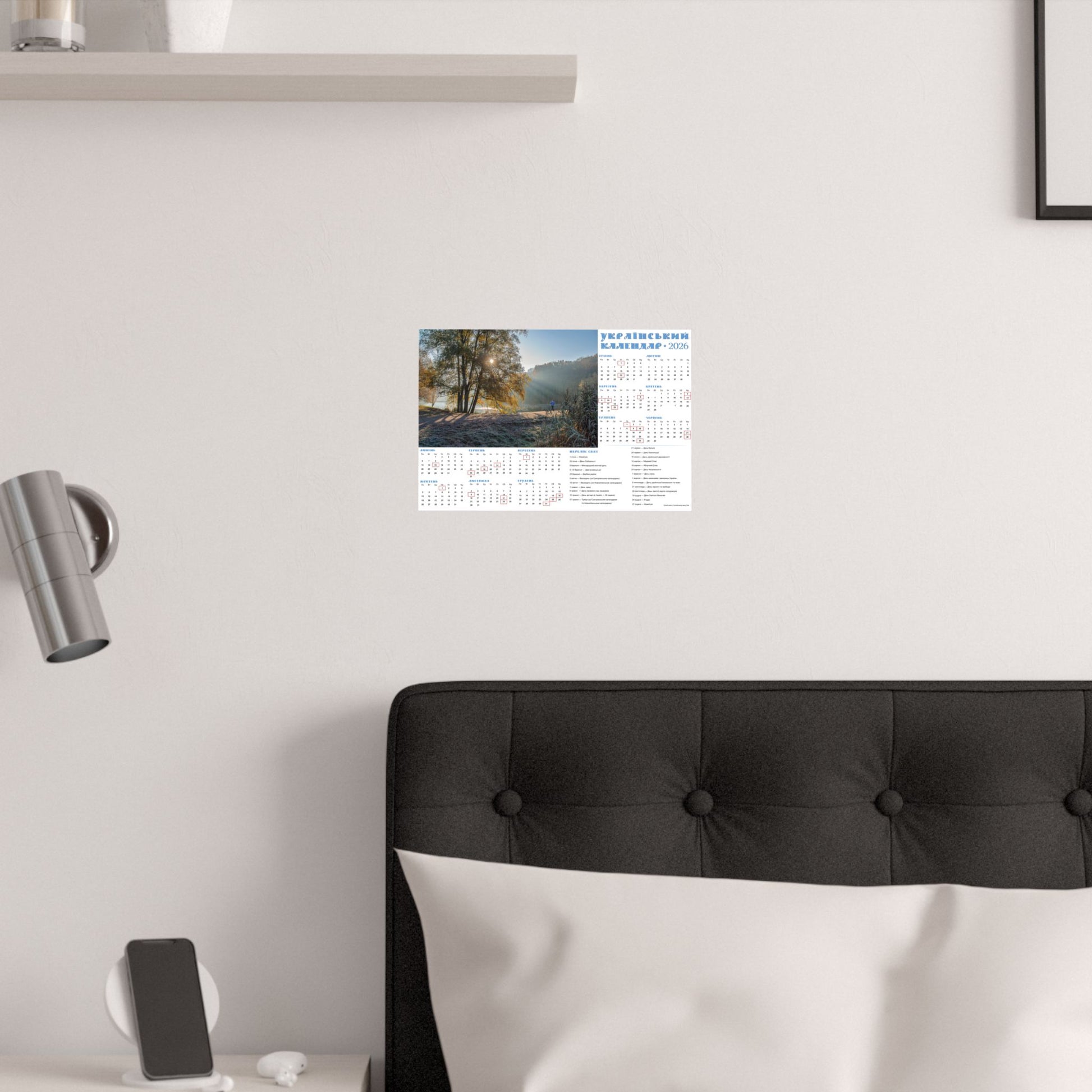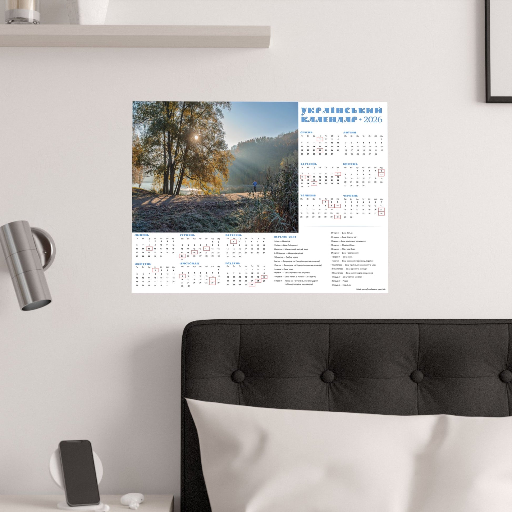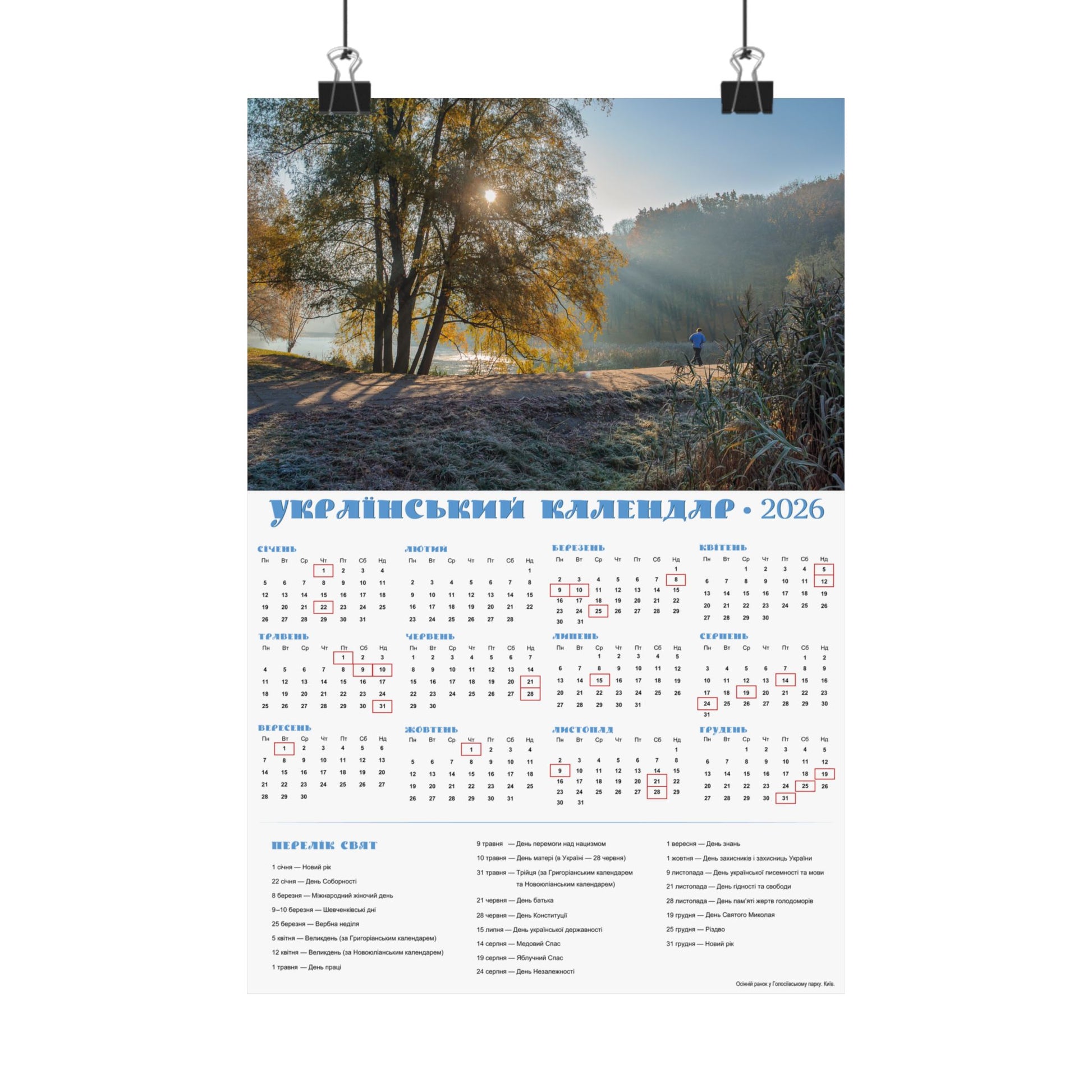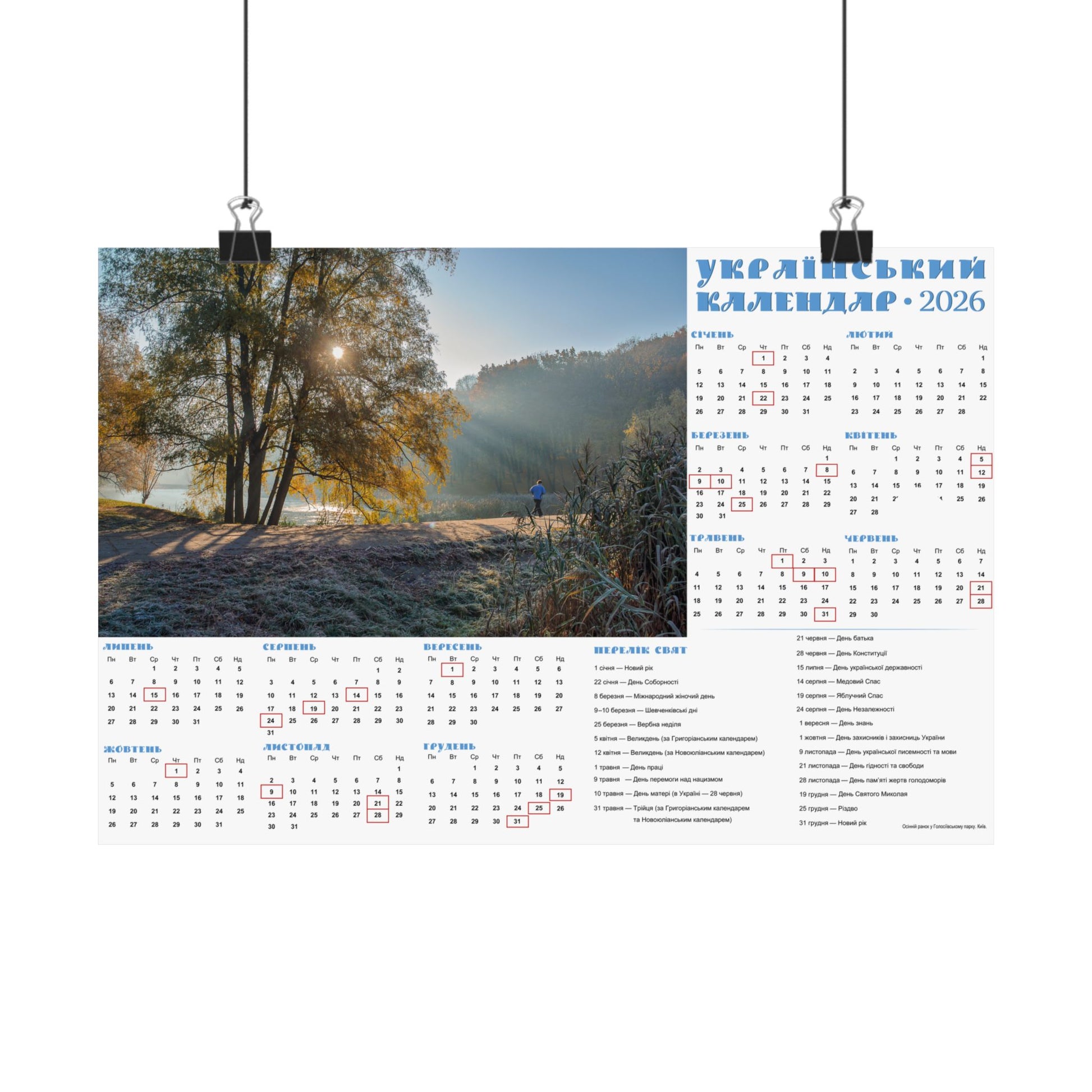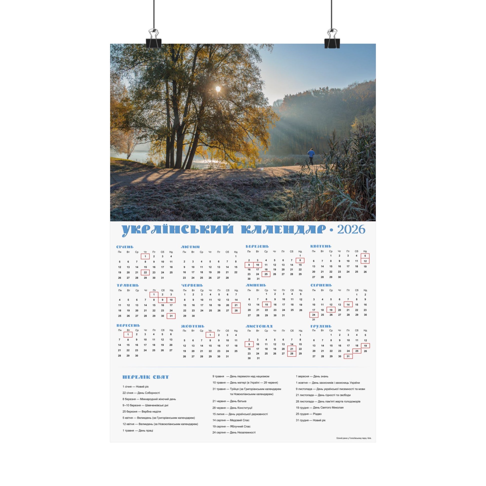 A satin poster printed on museum-grade satin paper that brings a calm, sunlit morning into your home. The image captures a misty riverside at dawn—soft rays filtering through trees, cool frost on the grass, and a quiet sense of slow, early light. The calendar layout beside the photo makes this piece both decorative and useful: months arranged clearly with local holidays marked, and a compact reference panel for planning the year. Low-glare satin finish keeps reflections subtle so the scene and calendar details stay readable in natural light. Hang it in a kitchen, entryway, studio, or office to anchor your day with a gentle, contemplative moment each time you pass by.