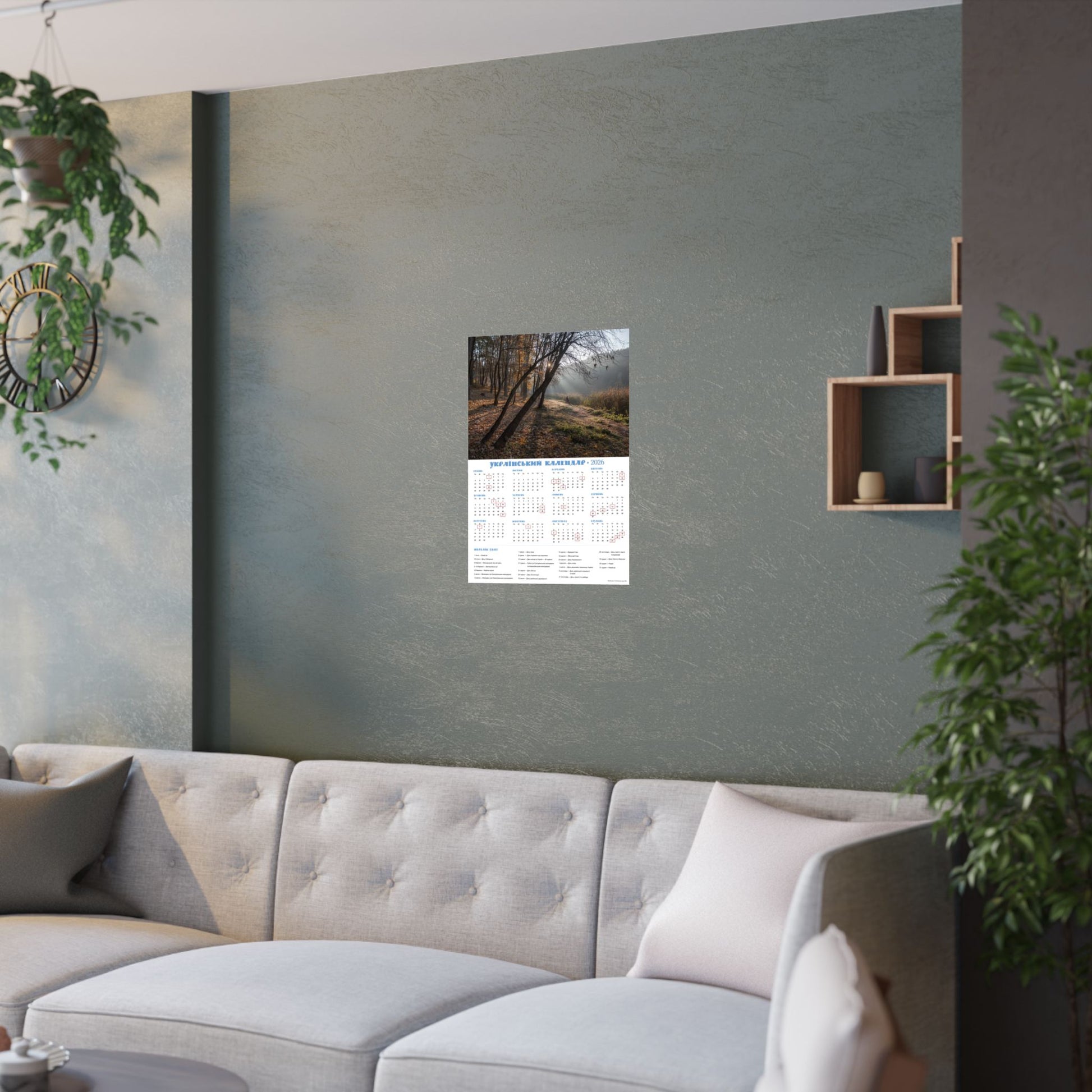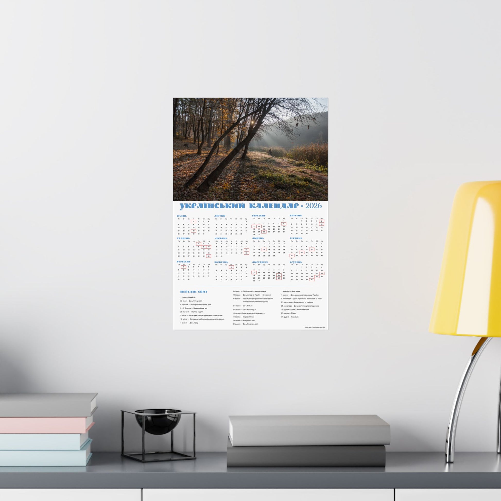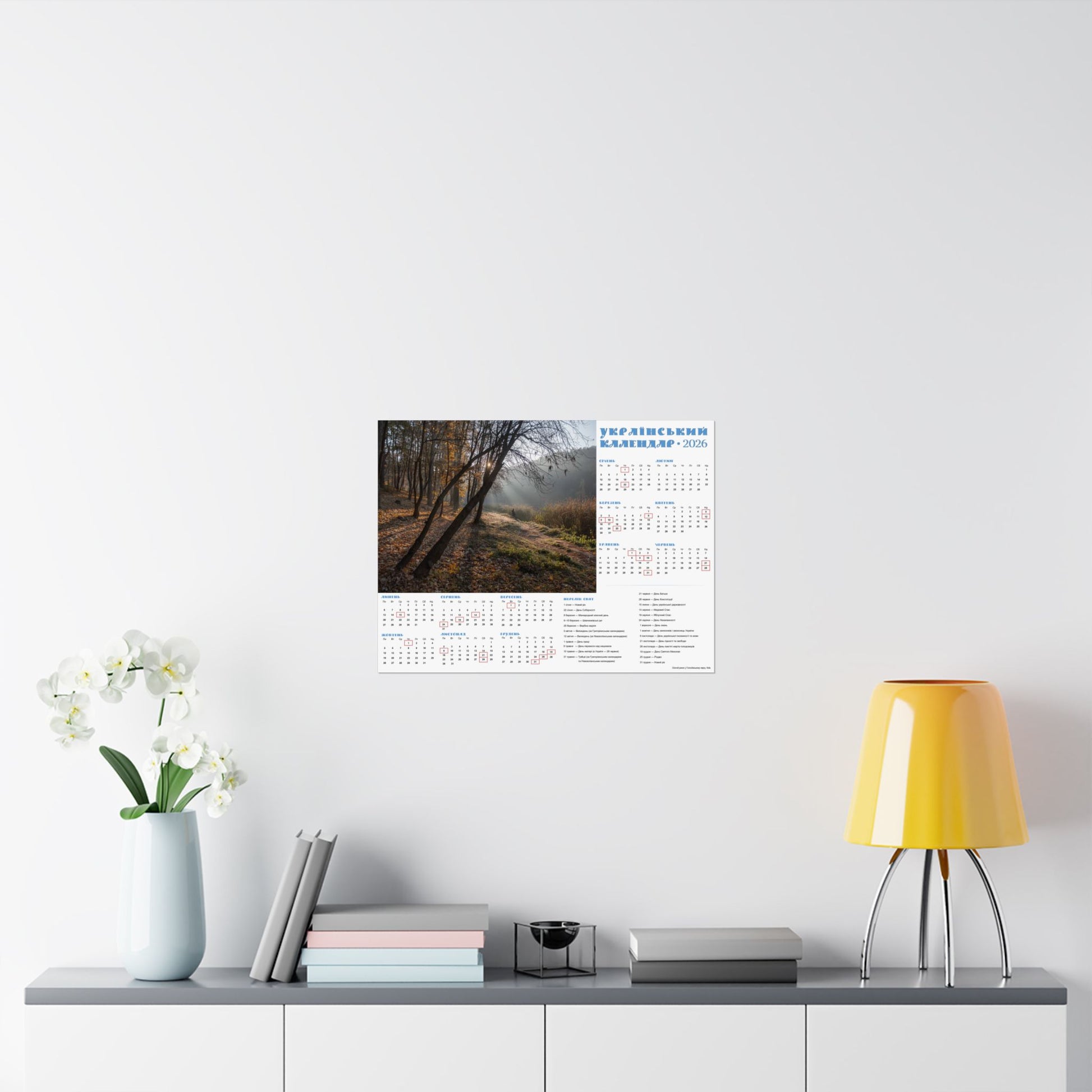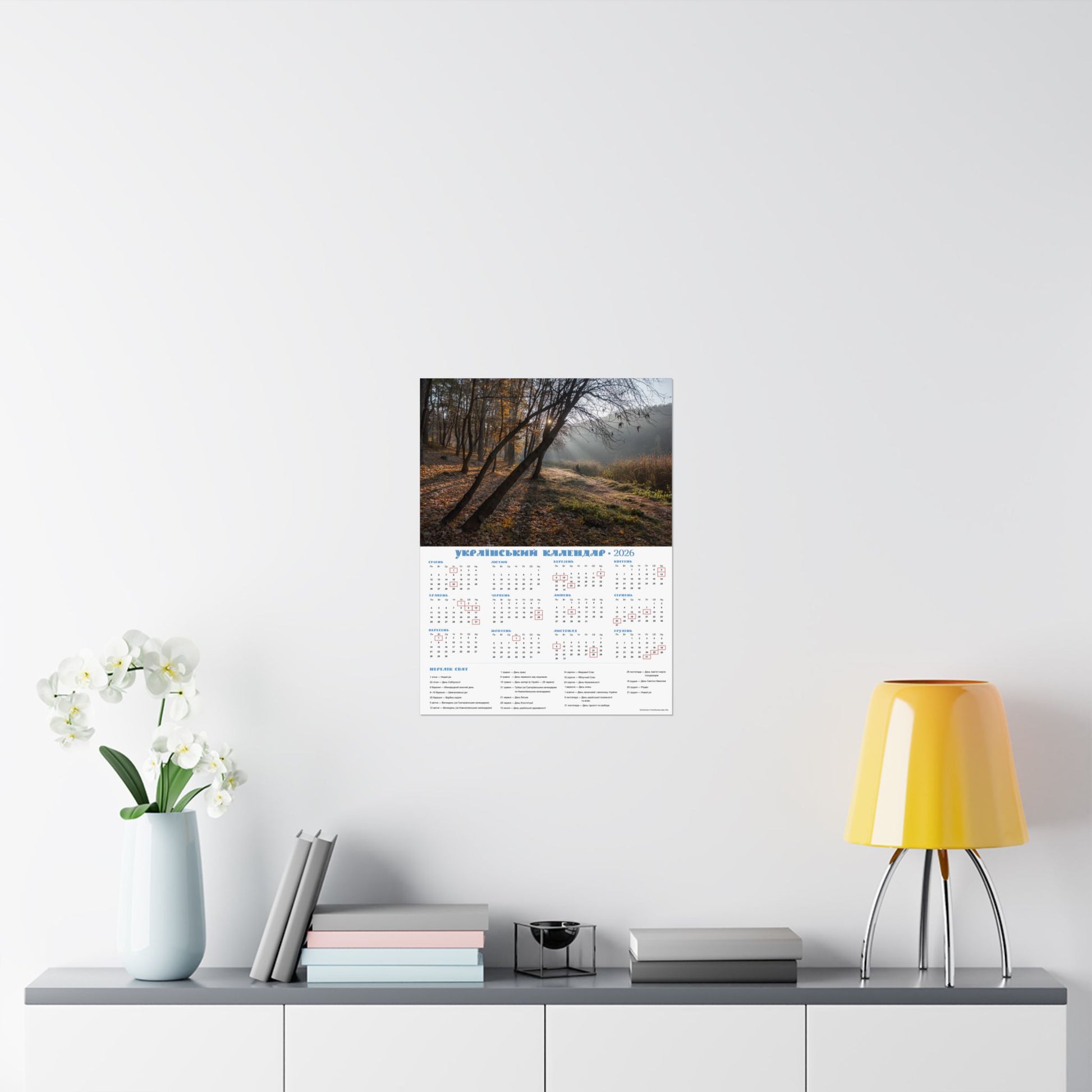 This satin poster brings a quiet, late-autumn moment into any indoor space. Printed on smooth, low-glare museum-grade paper, the image captures soft morning light filtering through trees and a dew-kissed meadow—an atmosphere of calm and gentle reflection. The calendar layout is integrated into the design, making this both a visual focal point and a functional wall piece for the year. Colors stay vivid thanks to pigment inks and modern printing methods, while the archival paper resists yellowing so the scene keeps its mood for years. Hang it framed or simple with tacks or double-sided tape to add a thoughtful, contemplative touch to an office, kitchen, or study.