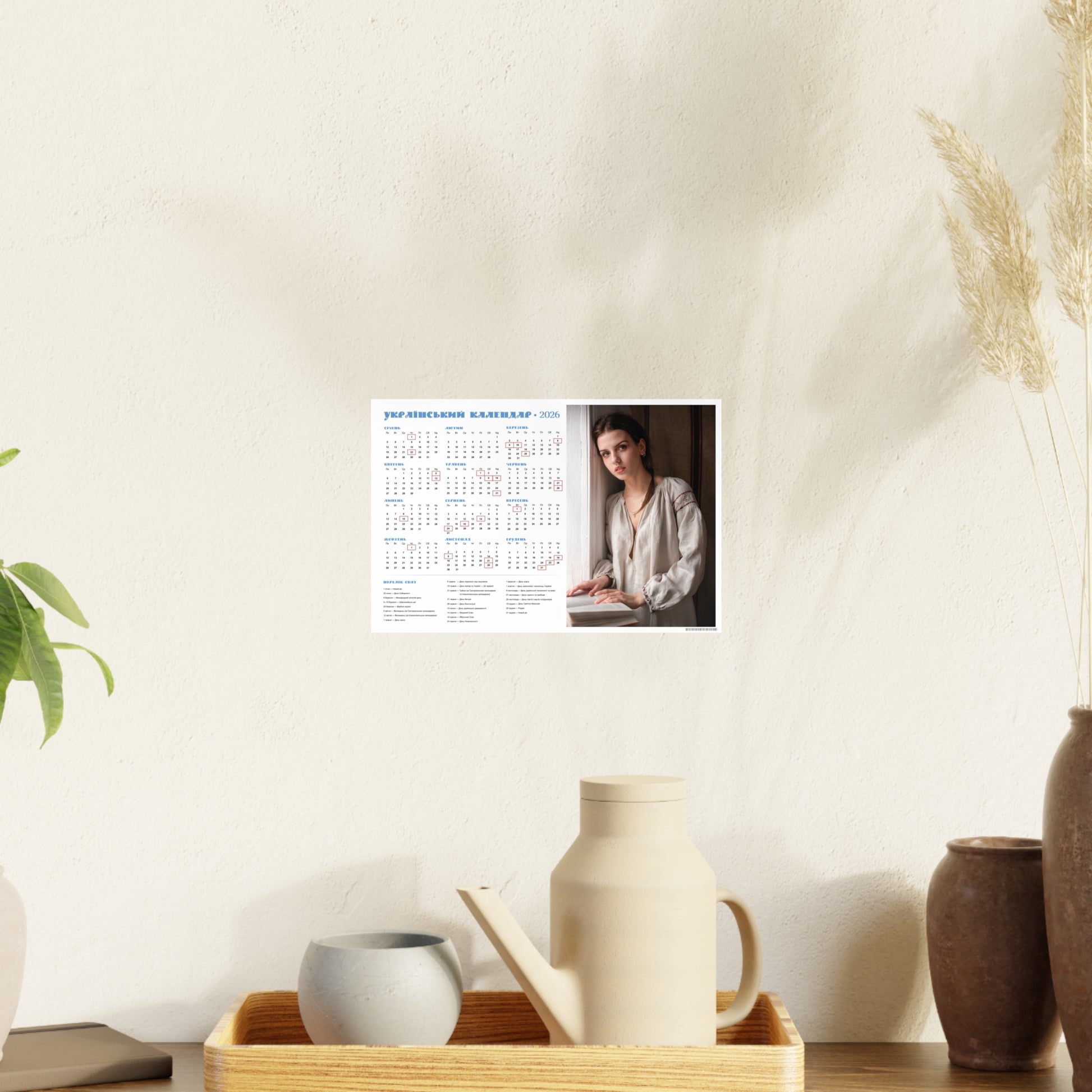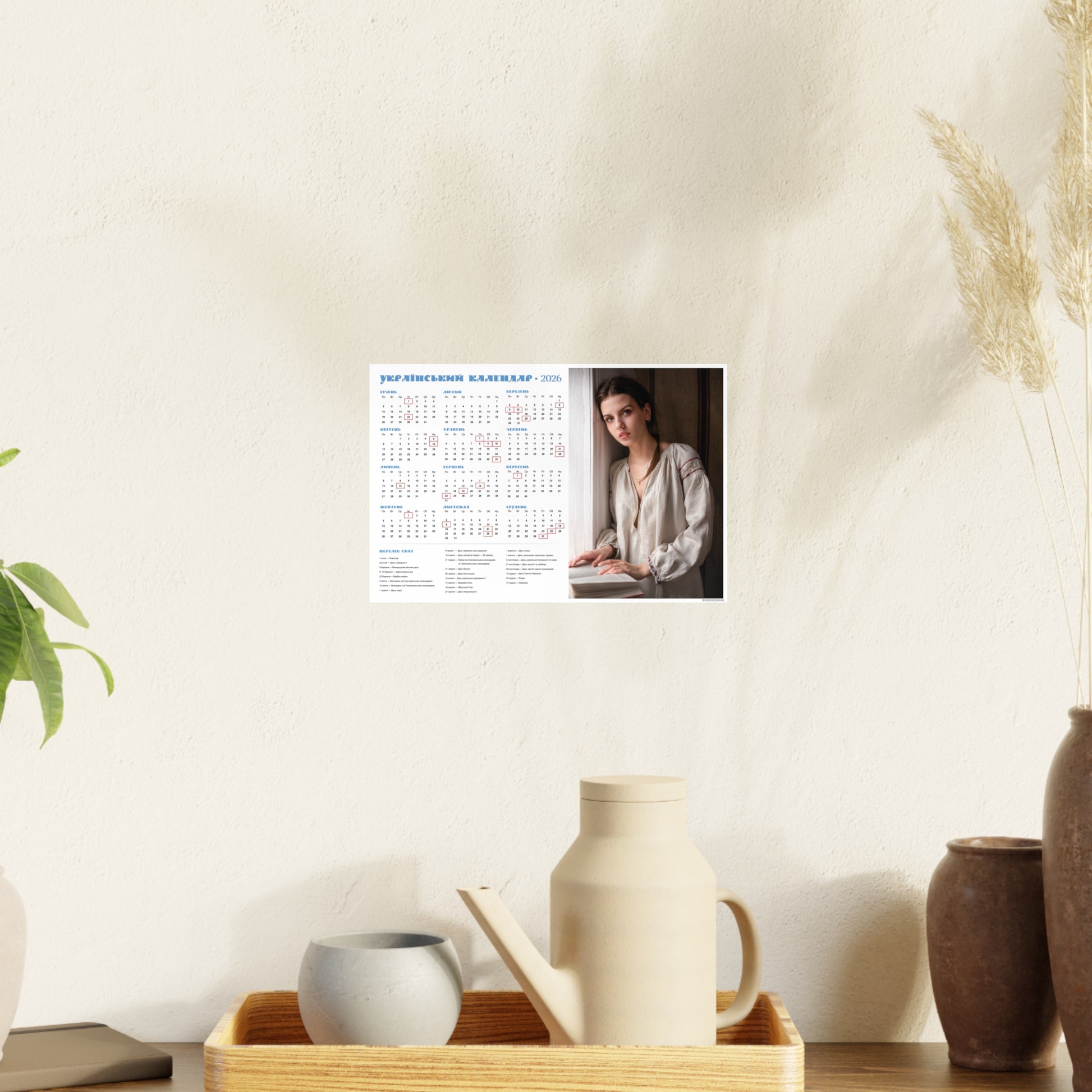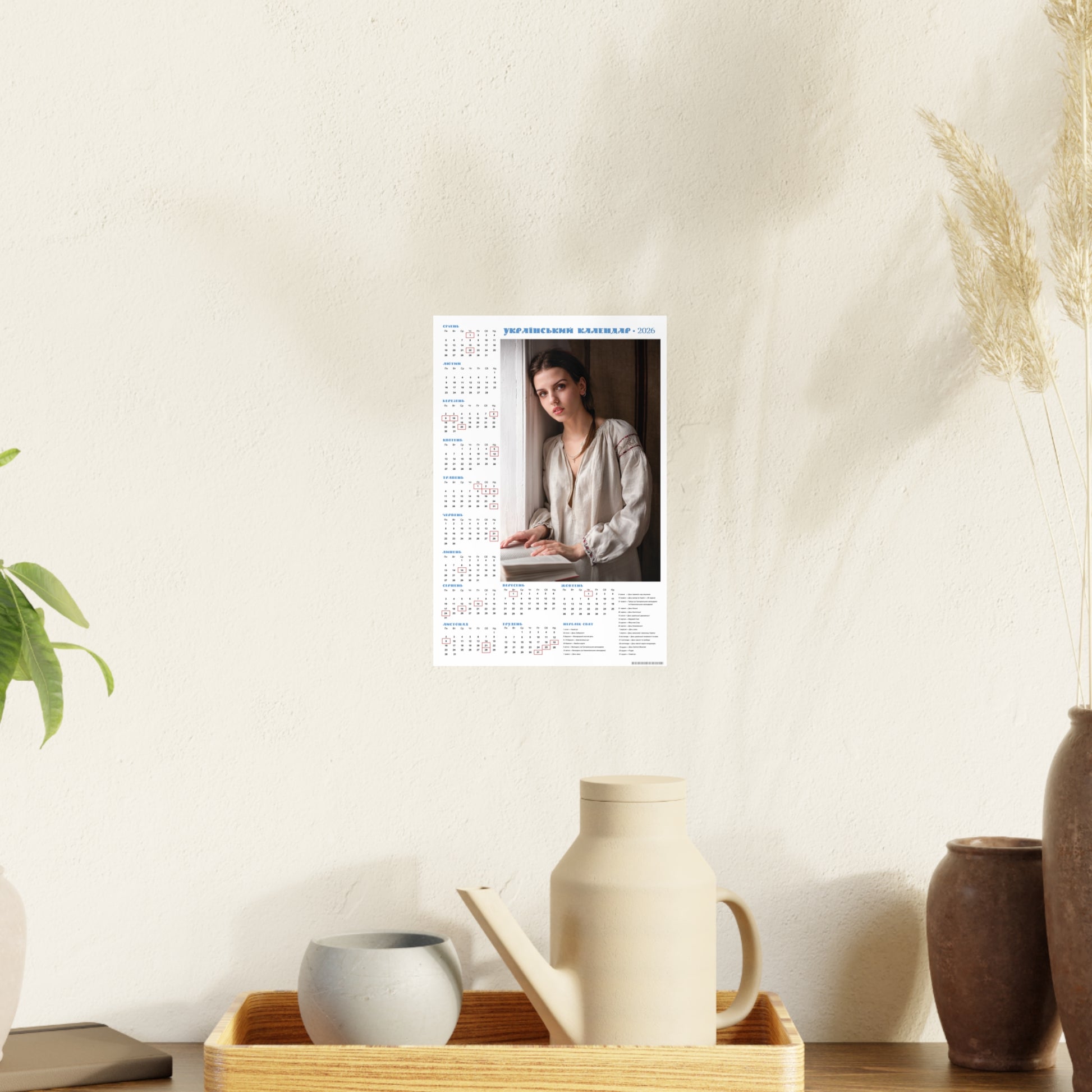 The one-page poster calendar "With a book" belongs to the series 2026 Ukrainian Calendar CANADA, created exclusively for Ukrainians and friends of Ukraine in CANADA. The vocation of this series is to add Ukrainian coziness to your home, so poignantly native and thick with the scents of mint, wild thyme, lovage and other fragrancy; to become a window into the Ukrainian coziness, wherever you are.