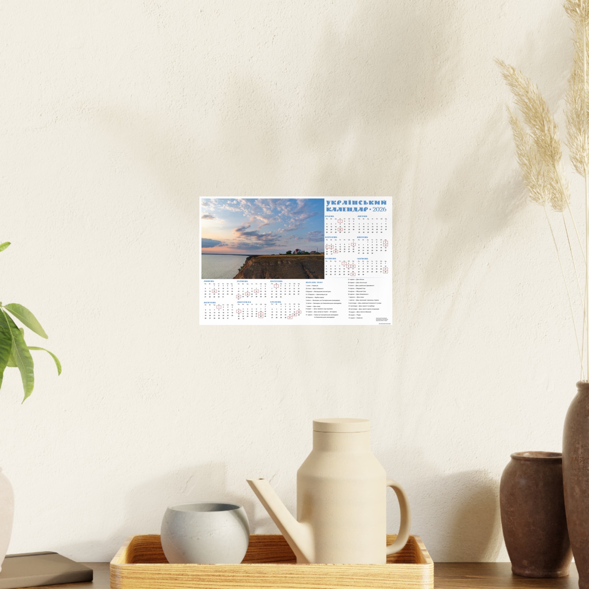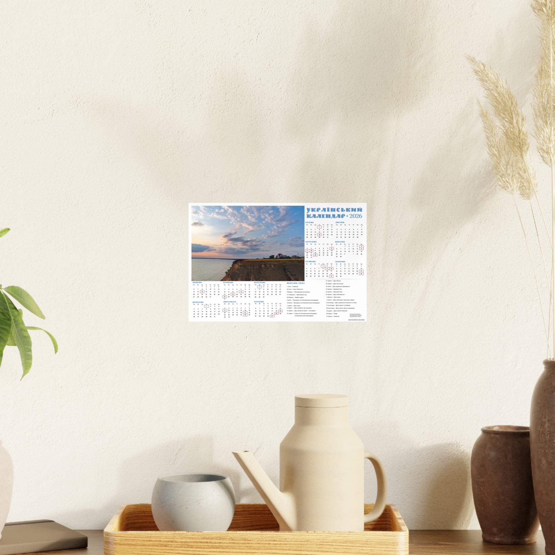 The one-page poster calendar "Kherson Grand Canyon" belongs to the series 2026 Ukrainian Calendar CANADA, created exclusively for Ukrainians and friends of Ukraine in CANADA. The vocation of this series is to add Ukrainian coziness to your home, so poignantly native and thick with the scents of mint, wild thyme, lovage and other fragrancy; to become a window into the Ukrainian coziness, wherever you are.