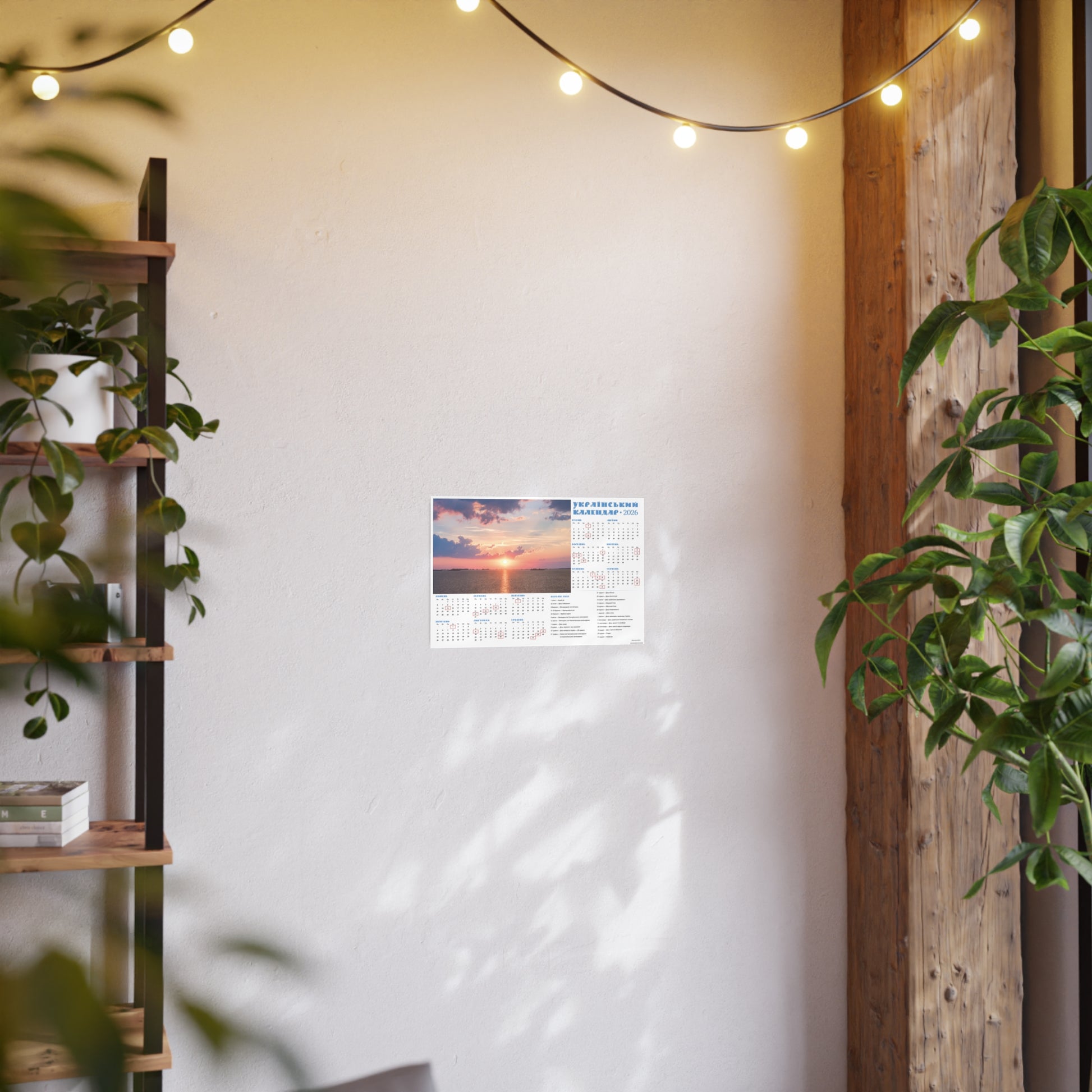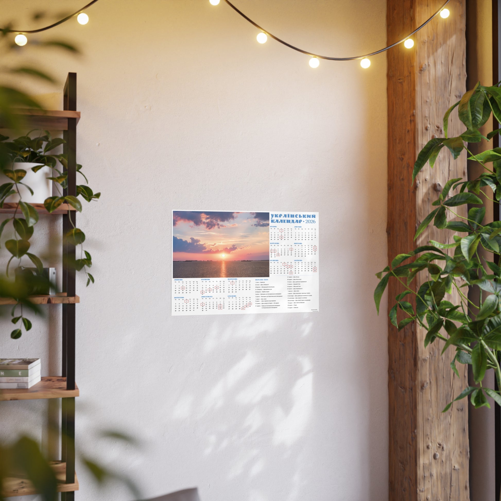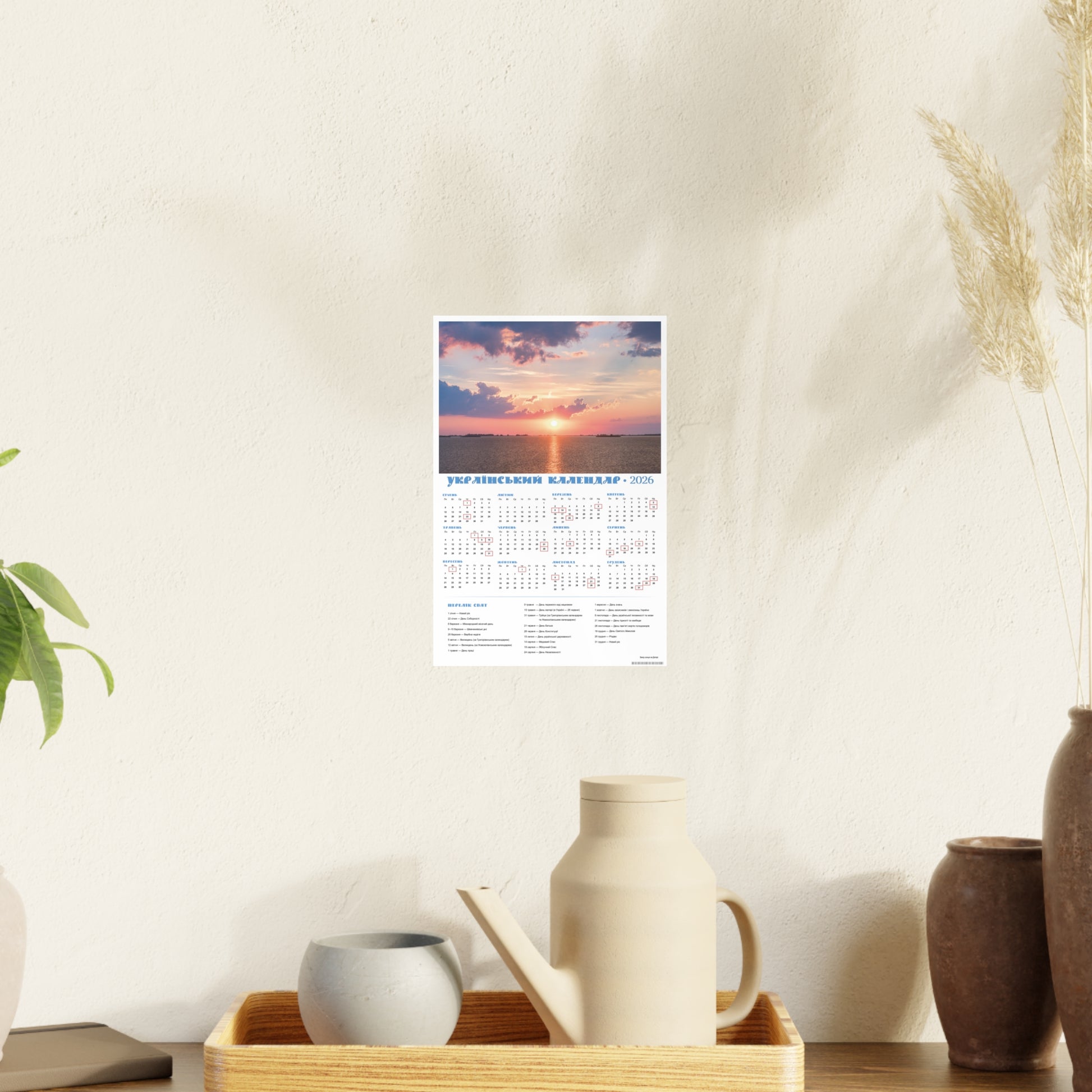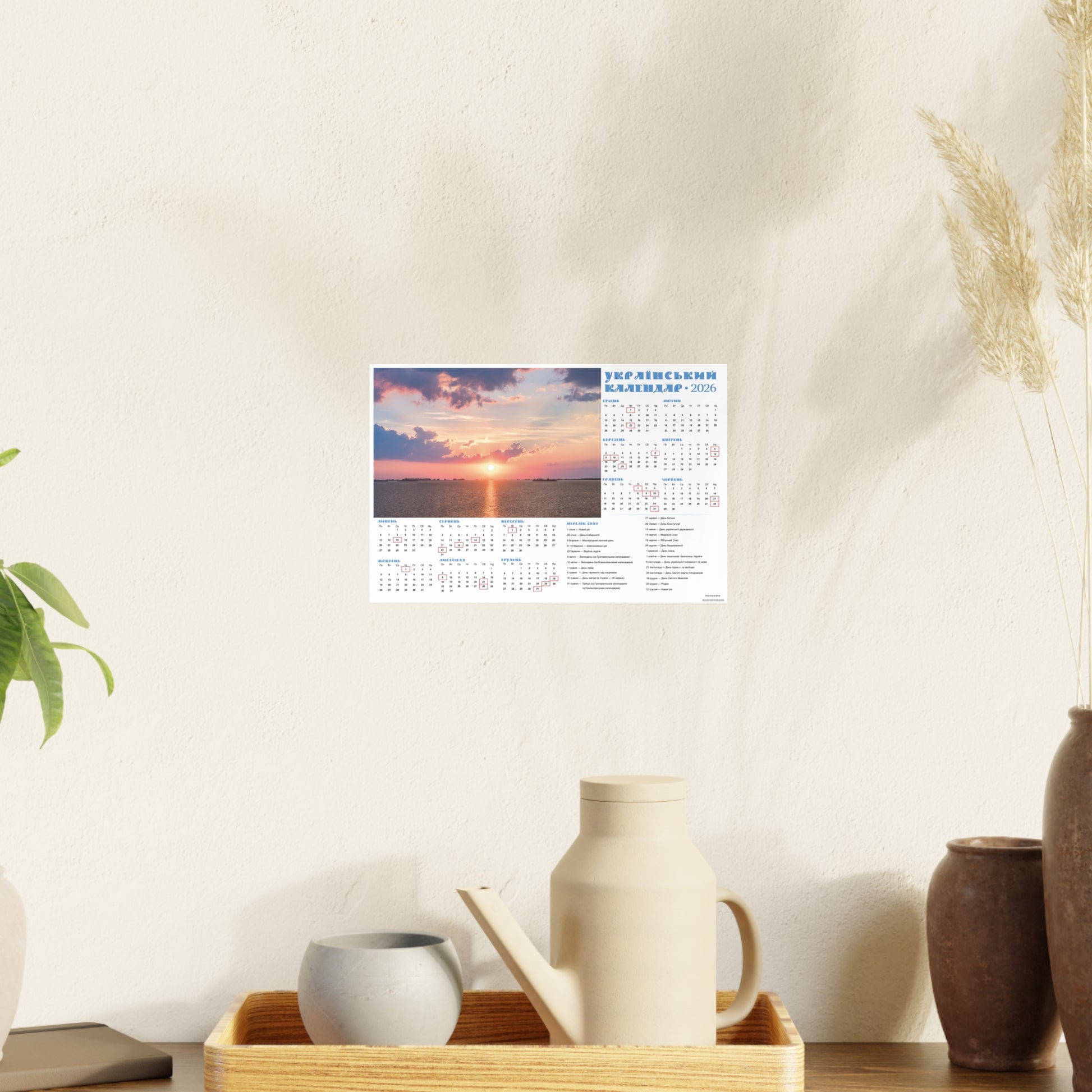 The one-page poster calendar "Sunset on the Dnipro" belongs to the series 2026 Ukrainian Calendar CANADA, created exclusively for Ukrainians and friends of Ukraine in CANADA. The vocation of this series is to add Ukrainian coziness to your home, so poignantly native and thick with the scents of mint, wild thyme, lovage and other fragrancy; to become a window into the Ukrainian coziness, wherever you are.
