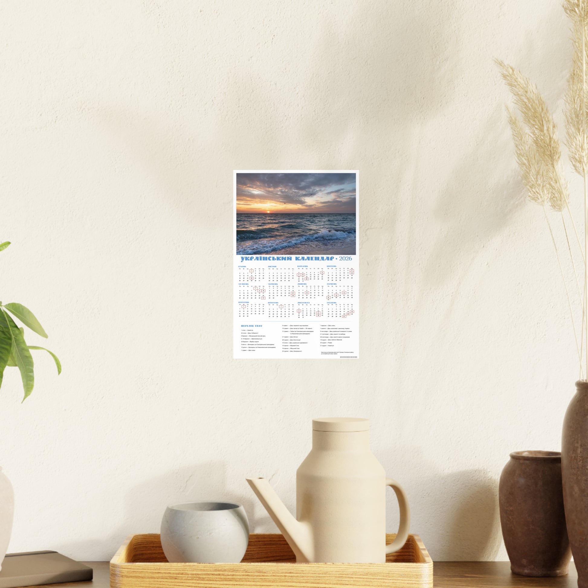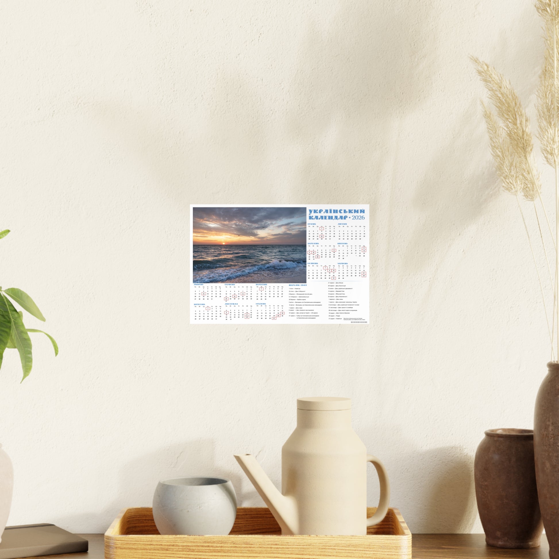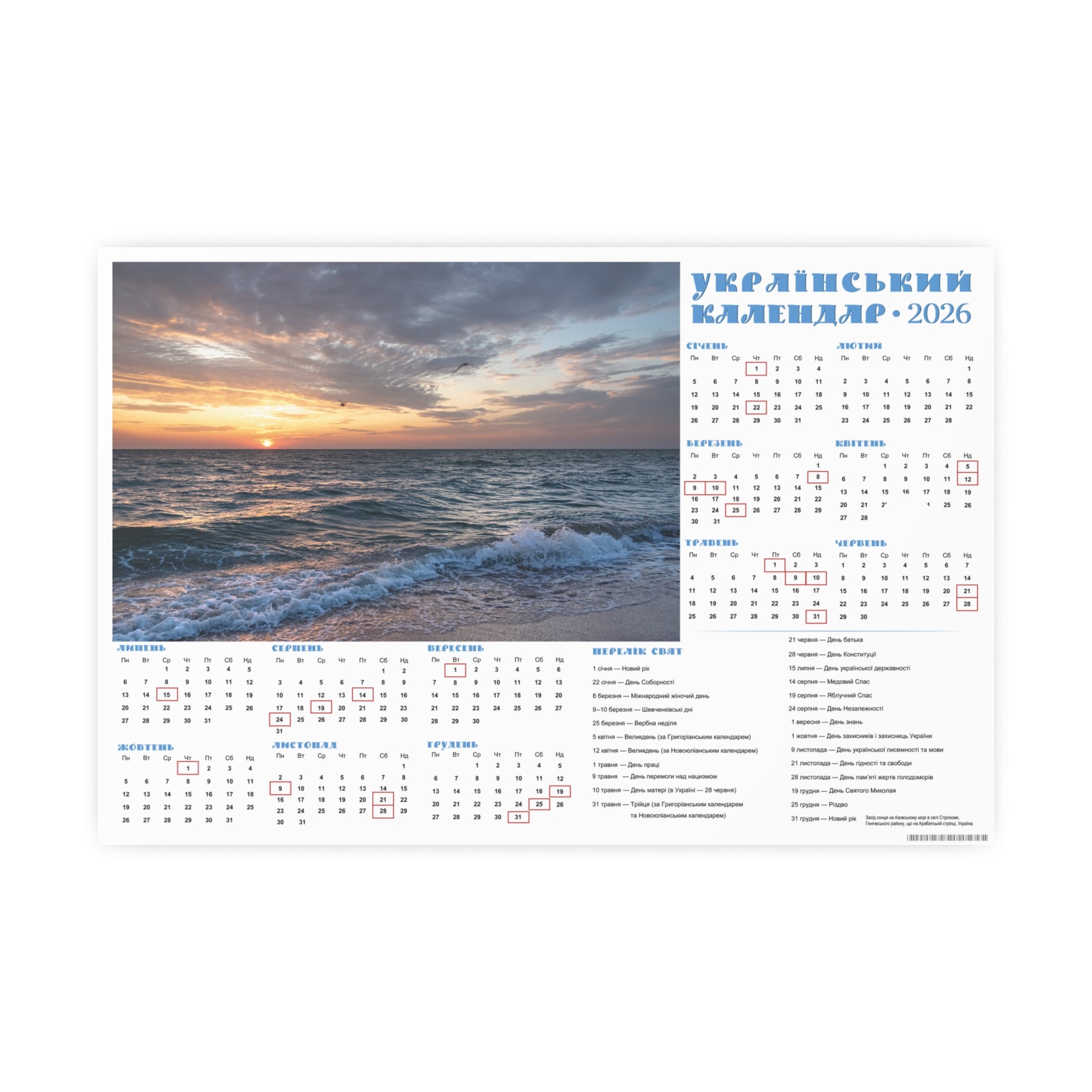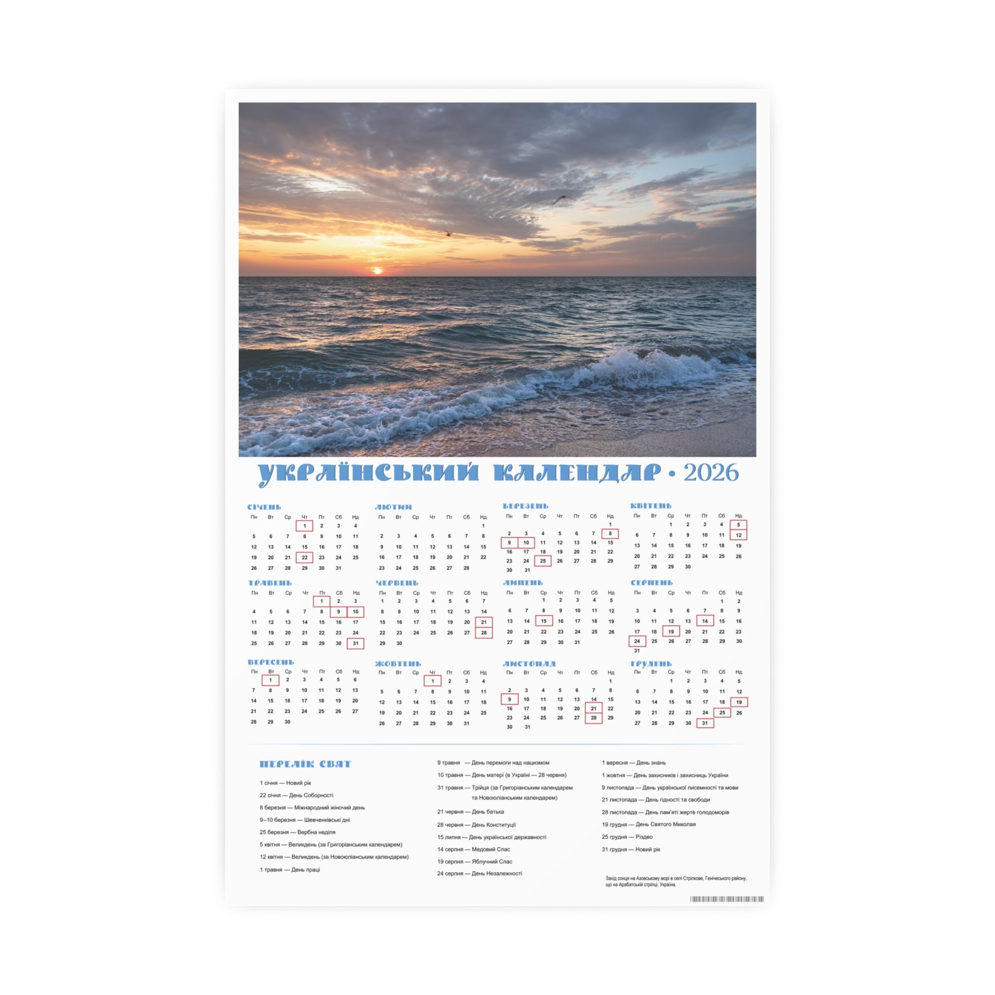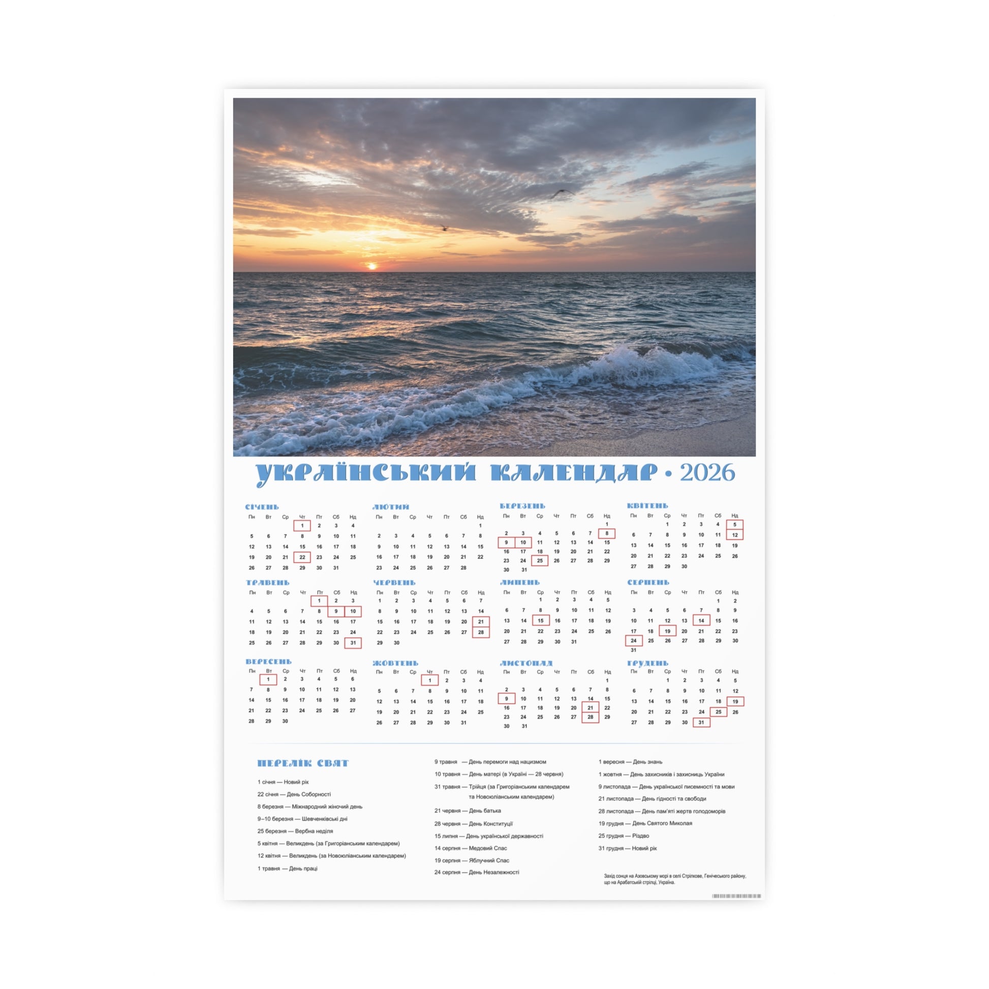 The one-page poster calendar "Sunset on the Sea of Azov in the village of Strilkove" belongs to the series 2026 Ukrainian Calendar CANADA, created exclusively for Ukrainians and friends of Ukraine in CANADA. The vocation of this series is to add Ukrainian coziness to your home, so poignantly native and thick with the scents of mint, wild thyme, lovage and other fragrancy; to become a window into the Ukrainian coziness, wherever you are.