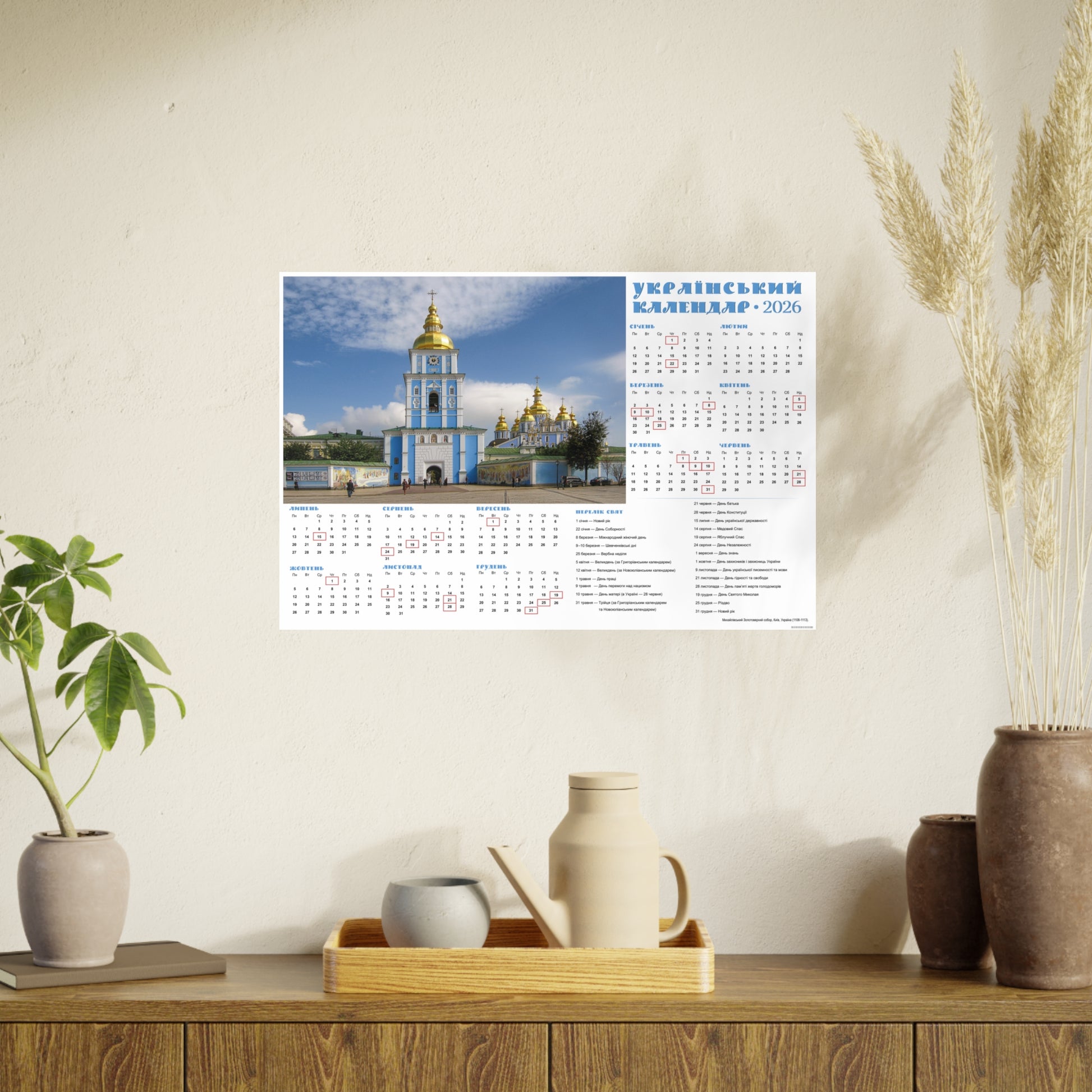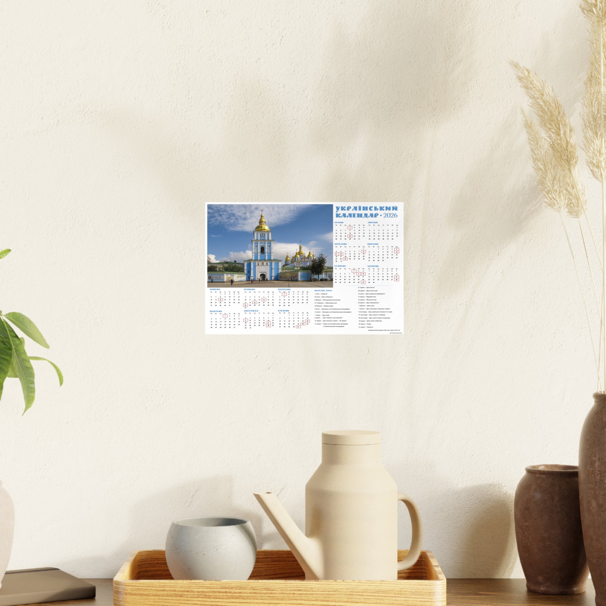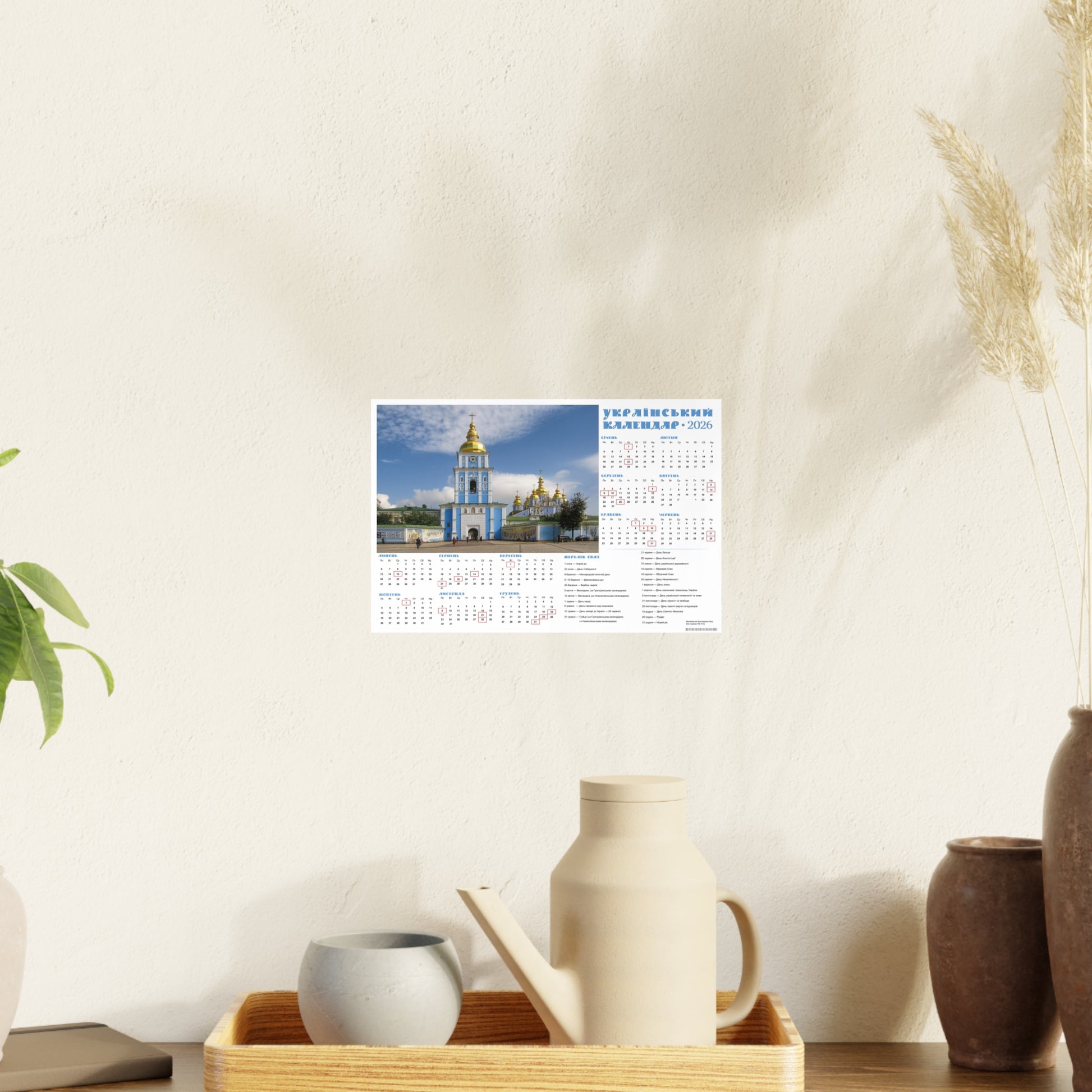 The one-page poster calendar "The St. Michael's Golden-Domed Cathedral in Kyiv" belongs to the series 2026 Ukrainian Calendar CANADA, created exclusively for Ukrainians and friends of Ukraine in CANADA. The vocation of this series is to add Ukrainian coziness to your home, so poignantly native and thick with the scents of mint, wild thyme, lovage and other fragrancy; to become a window into the Ukrainian coziness, wherever you are.