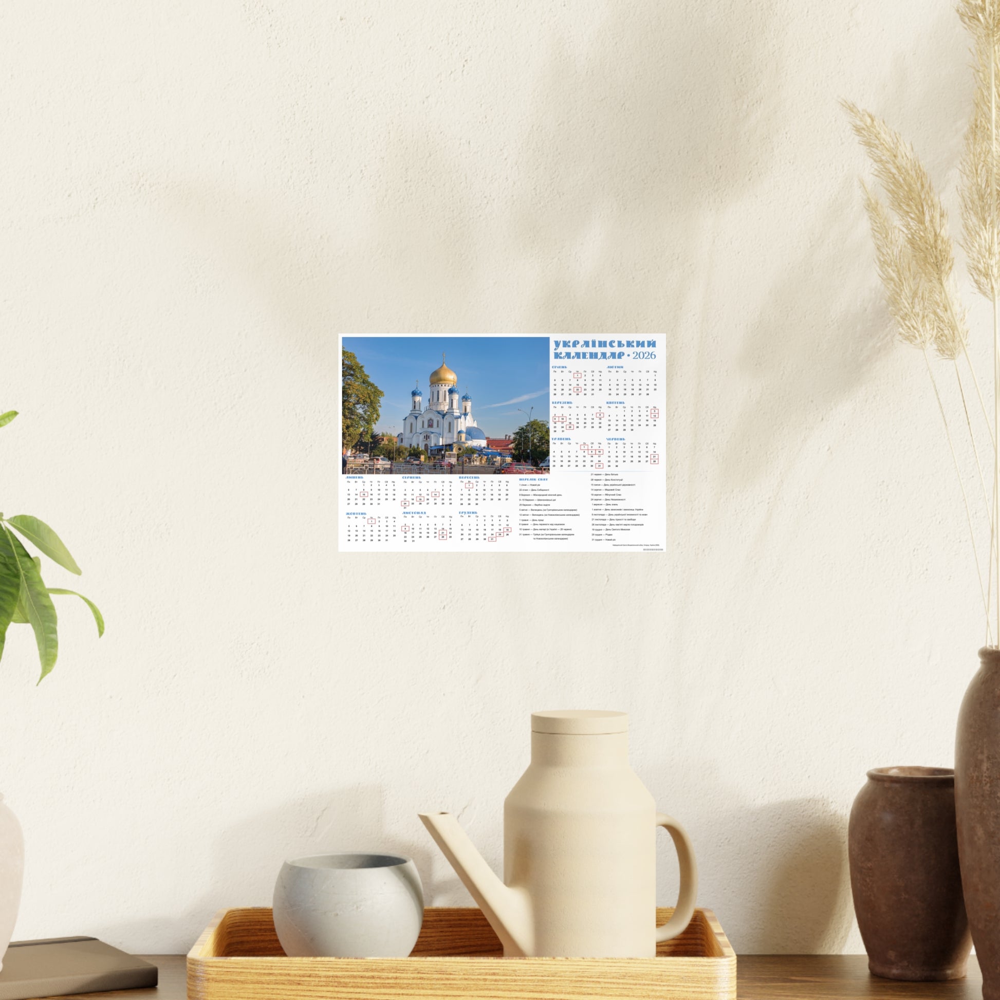 The one-page poster calendar "The Cathedral of Christ the Saviour in Uzhhorod" belongs to the series 2026 Ukrainian Calendar CANADA, created exclusively for Ukrainians and friends of Ukraine in CANADA. The vocation of this series is to add Ukrainian coziness to your home, so poignantly native and thick with the scents of mint, wild thyme, lovage and other fragrancy; to become a window into the Ukrainian coziness, wherever you are.