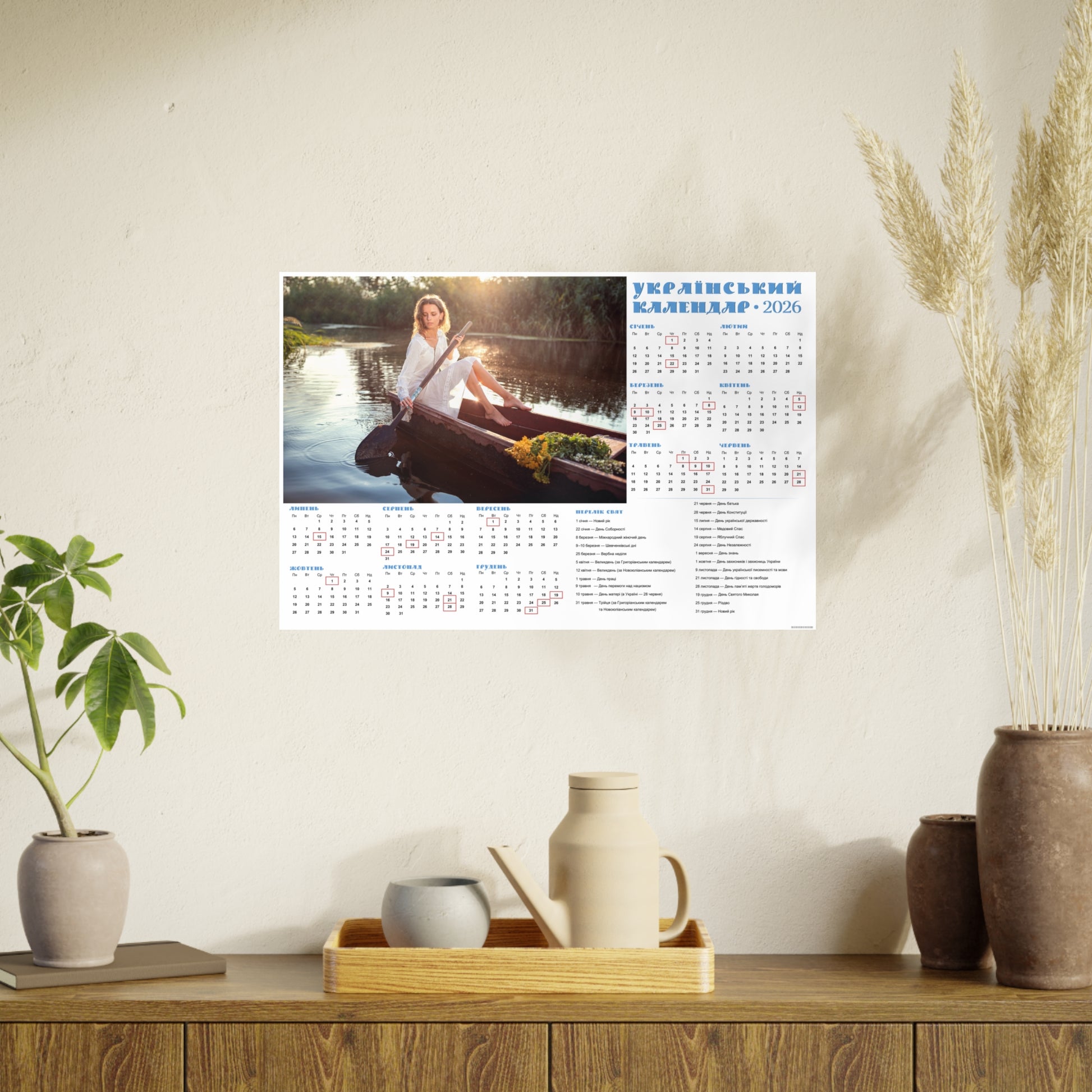 The one-page poster calendar "On the Tyasmyn River in Chyhyryn" belongs to the series 2026 Ukrainian Calendar CANADA, created exclusively for Ukrainians and friends of Ukraine in CANADA. The vocation of this series is to add Ukrainian coziness to your home, so poignantly native and thick with the scents of mint, wild thyme, lovage and other fragrancy; to become a window into the Ukrainian coziness, wherever you are.