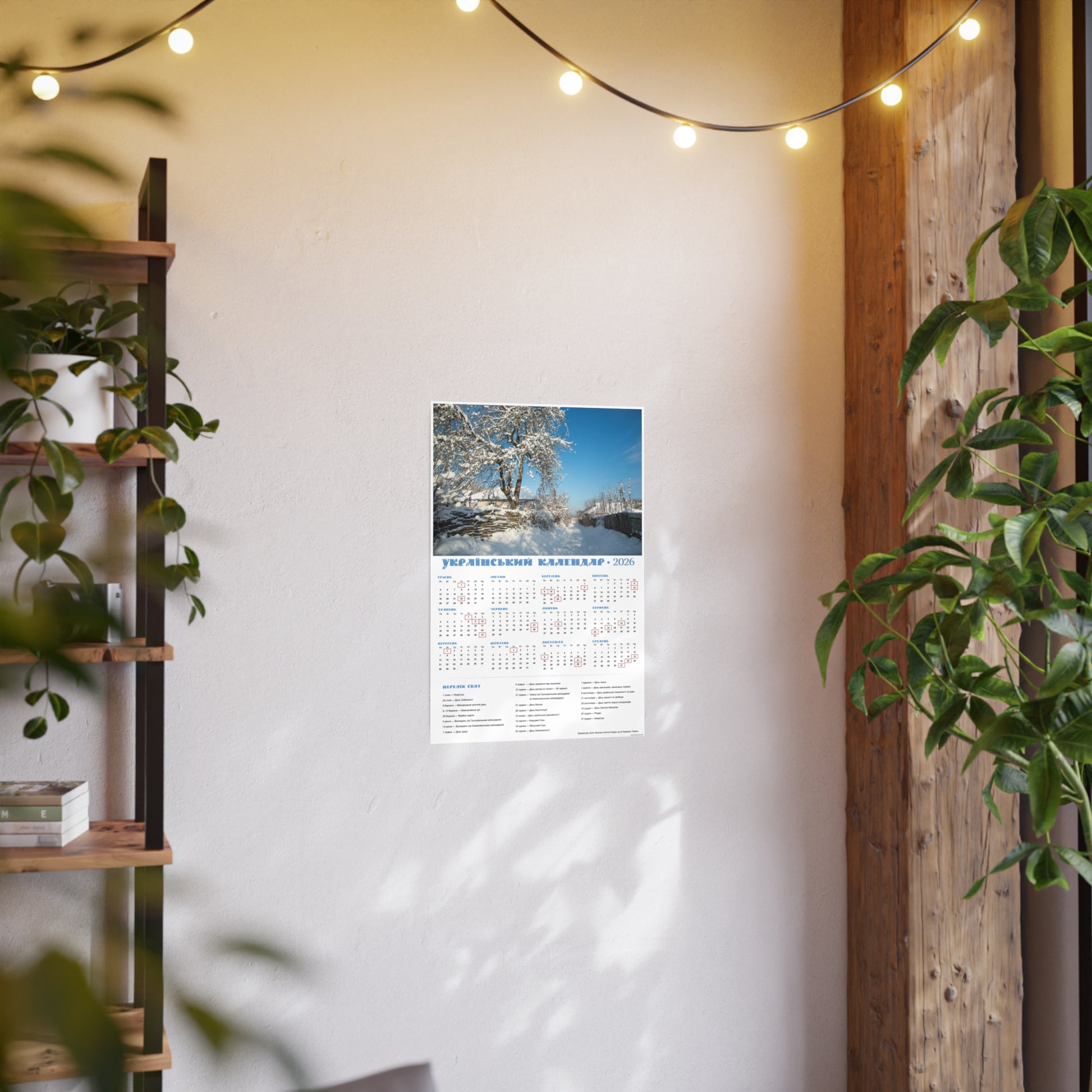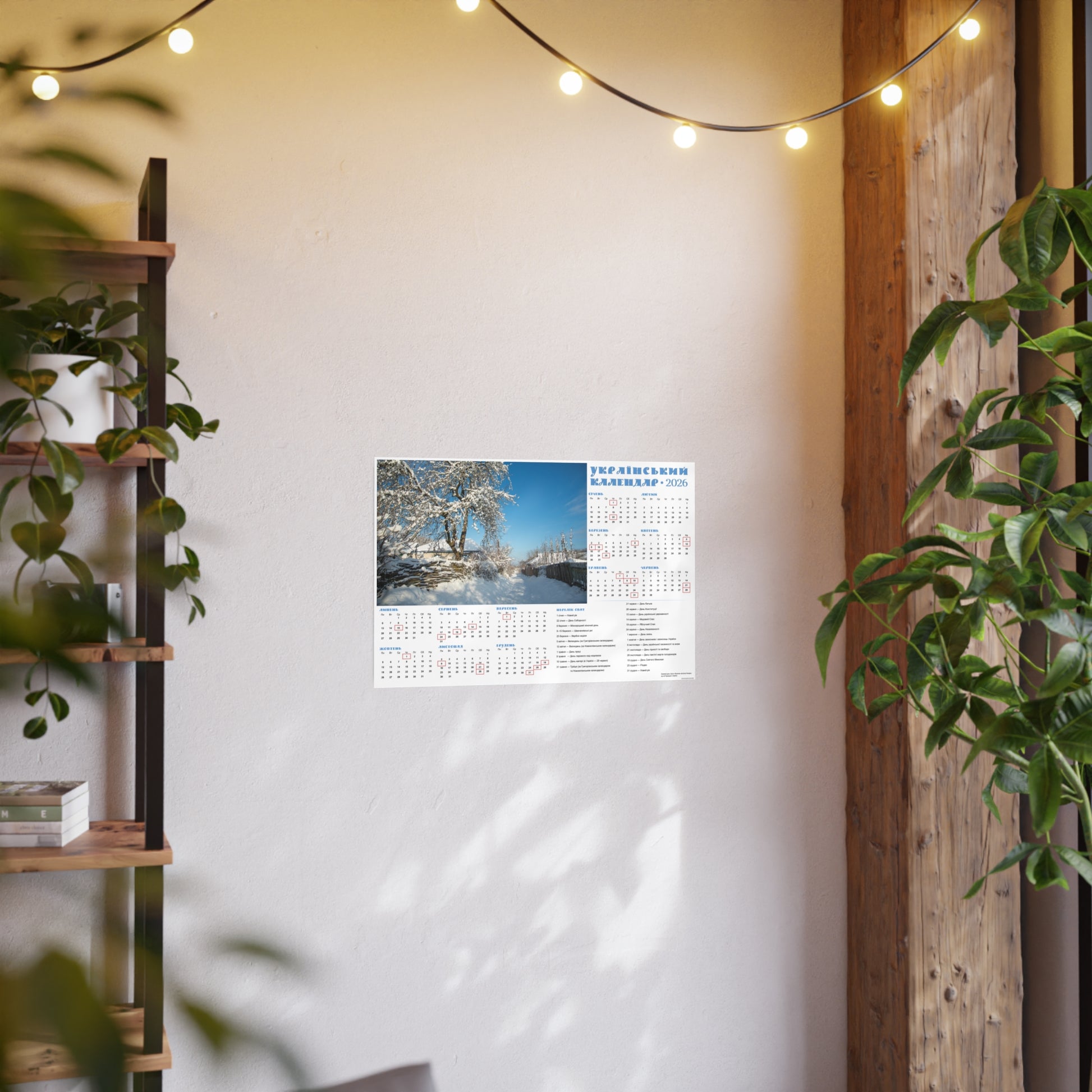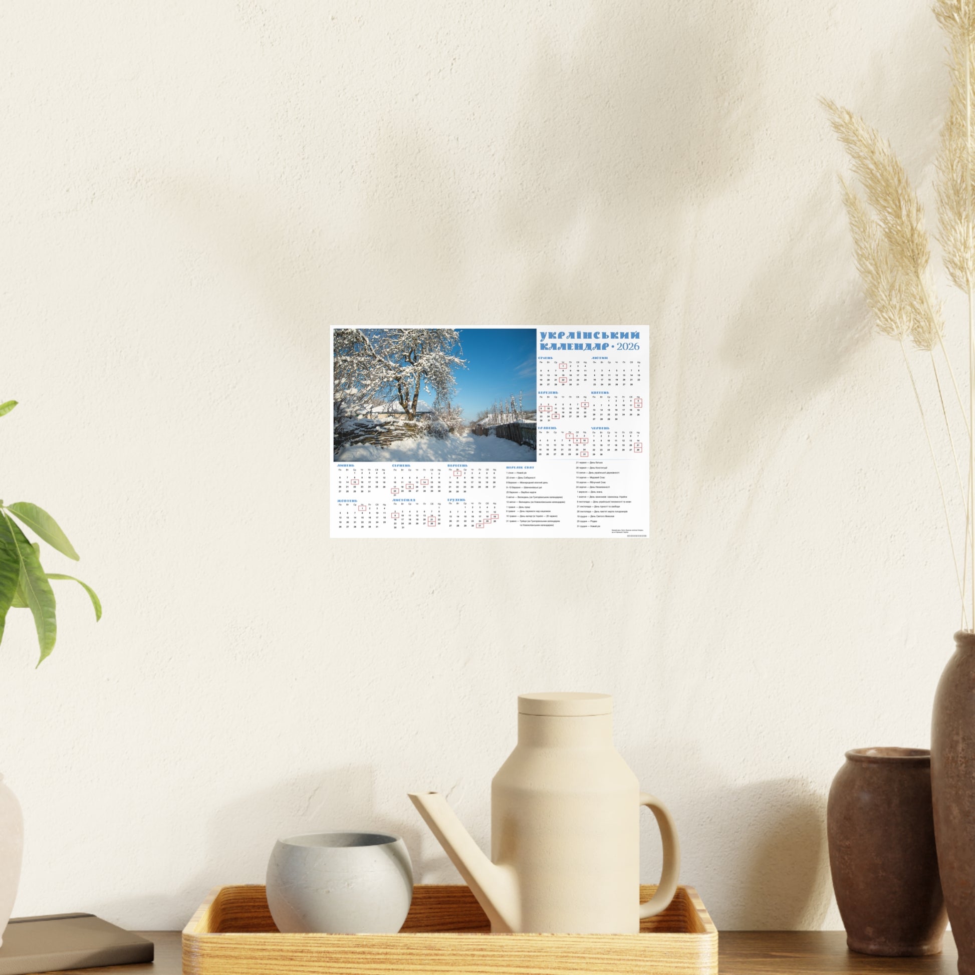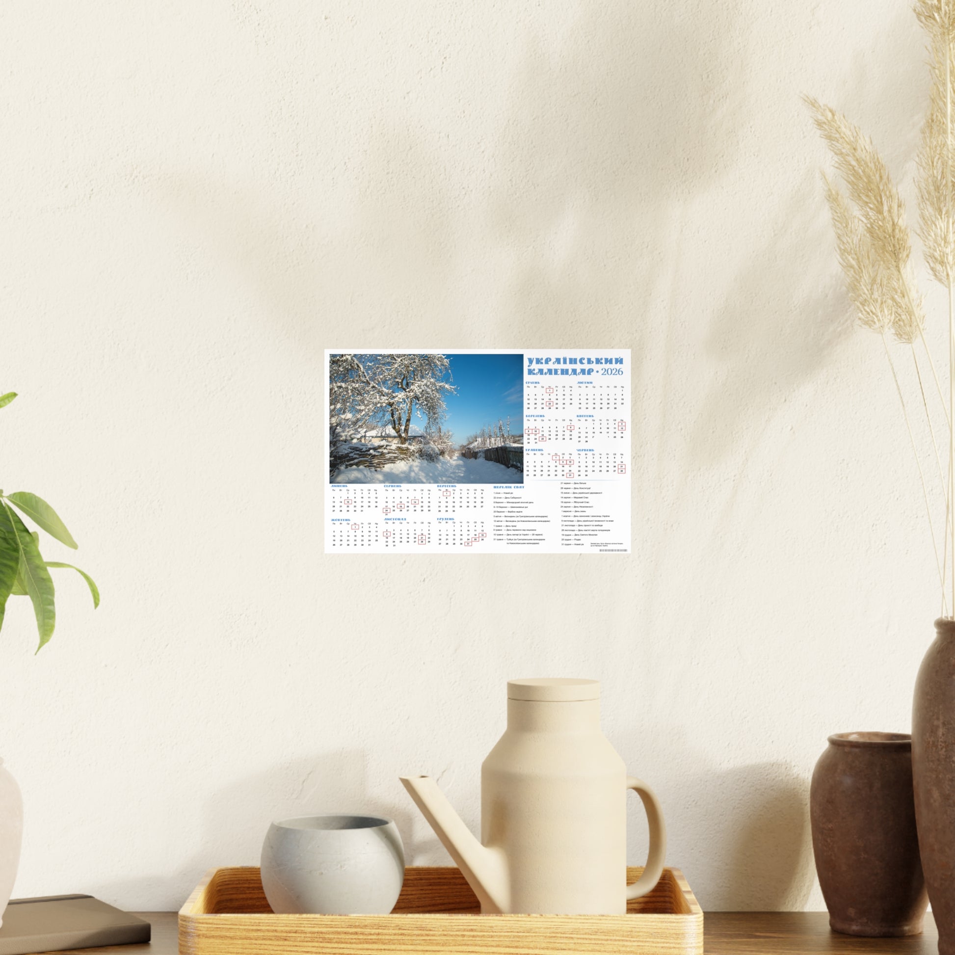 The one-page poster calendar "Winter day" belongs to the series 2026 Ukrainian Calendar CANADA, created exclusively for Ukrainians and friends of Ukraine in CANADA. The vocation of this series is to add Ukrainian coziness to your home, so poignantly native and thick with the scents of mint, wild thyme, lovage and other fragrancy; to become a window into the Ukrainian coziness, wherever you are.